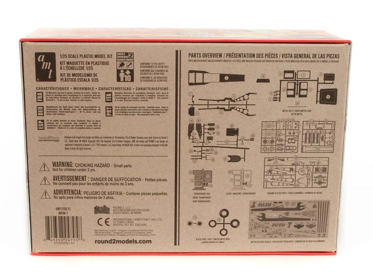 FEATURE PACKED: Infini-T, an iconic kit from the kats at AMT! Fully paintable, it features an expanded sheet of water-slide decals loaded with colorful new AND improved options. Features include a blown mega-engine with heavy-duty header/collector combo, super-trick frame with customized radius arms, pad printed rear slicks, and more. Wrapped up nicely in vintage-styled packaging!
