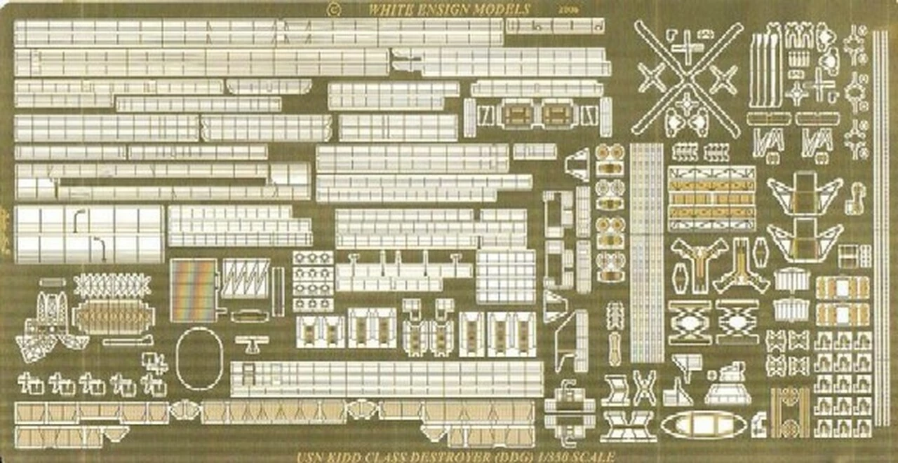 WEM 1/350 Kidd Class Destroyer (PE 35095). Covers the four ships of the class (DDG 993-996), which are improved versions of the Spruances. Contains: Focsle Railing Sections, Main Deck Mid Section Railings, Transom Railing, Fantail Side Railings, Fantail Step & Uptake Railings, Hangar Roof Railing Aft, Bridge Wing Railings, Signal Deck Railings, Forward Superstructure Step Railings, Forward ECM/ESM Platforms, Hangar Roof Side Railings, Forward Intake Vent Catwalk Railing, Forward Superstructure Starboard Railing, Mid Superstructure Side Railings, Superstructure Top Deckhouse Railings, Mid Superstructure Aft Railings, Intake Vent Box Top Railings, Small Side Platform Railings, Boat Deck Boarding Platforms, Boat Deck Upper Access Platform, Upper Access Platform Railings, Main Deck Aft Railings, Aft Superstructure Extension Supports, Mainmast Fittings, Foremast Fittings, SPS- 49 Radar Antenna, SPS-48 Radar Antenna, Inclined Ladders (Boat Deck Mid), Inclined Ladders (Fantail Step), Inclined Ladders (Bridge Wings), Inclined Ladder (Fwd Superstructure Step), Inclined Ladders (Boat Deck Lower), Starboard Aft Superstructure Forward Extension, .50 Cal. Machine Guns, Spare Railing Sections, Flight Deck Safety Nets (Port), Flight Deck Safety Nets (Aft), Flight Deck Safety Nets (Starboard), Flight Deck Safety Nets (Sponson), Flight Deck Safety Nets (Sponson), Boat Upper Platforms, SH-60B Helicopter Fittings (Spread), SH-60B Helicopter Fittings (Folded), .50 Cal. Machine Gun Tripods, Anchor Chain, Floodlight Banks, Helicopter Rotor Blade Cradles, Stock Vertical Ladders, Stowed Accommodation Ladders, Harpoon Missile Canister Cradles, Refueling Hose Reel, Single Davit Assembly, Boat Falls for Single Davit, Capstan Brake Wheels & Spray Shields, Front Double Doors, Cantilever Type Boat Cradles, Hawse Pipe Cover Grilles, Port Boat Deck Cradle, Boat Deck End Railings, Motor Boat Fittings, RHIB Cradles, Starboard Boat Deck Cradle, Whaleboat Fittings, SATCOM Antenna Assembly, Fire Hose Points.