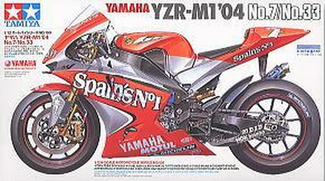 Accurate 1/12 scale model of 2004 World Champion Bike Yamaha YZR-M1. Compact 4-cylinder 990cc engine and surrounding power train accurately reproduced. Side and seat cowling can be removed after assembly allowing full display of engine. Includes No.33 M. Melandri additional seat cowling to allow modelers to create faithful reconstructions of each riders personalized machine. Synthetic rubber tires look and feel like authentic racing slick tires. Poly caps used for easy damper assembly and cowling attachment. High quality Cartograf decals for Carlos Checa No.7 bike and Marco Melandri No.33 bike France GP markings.Β