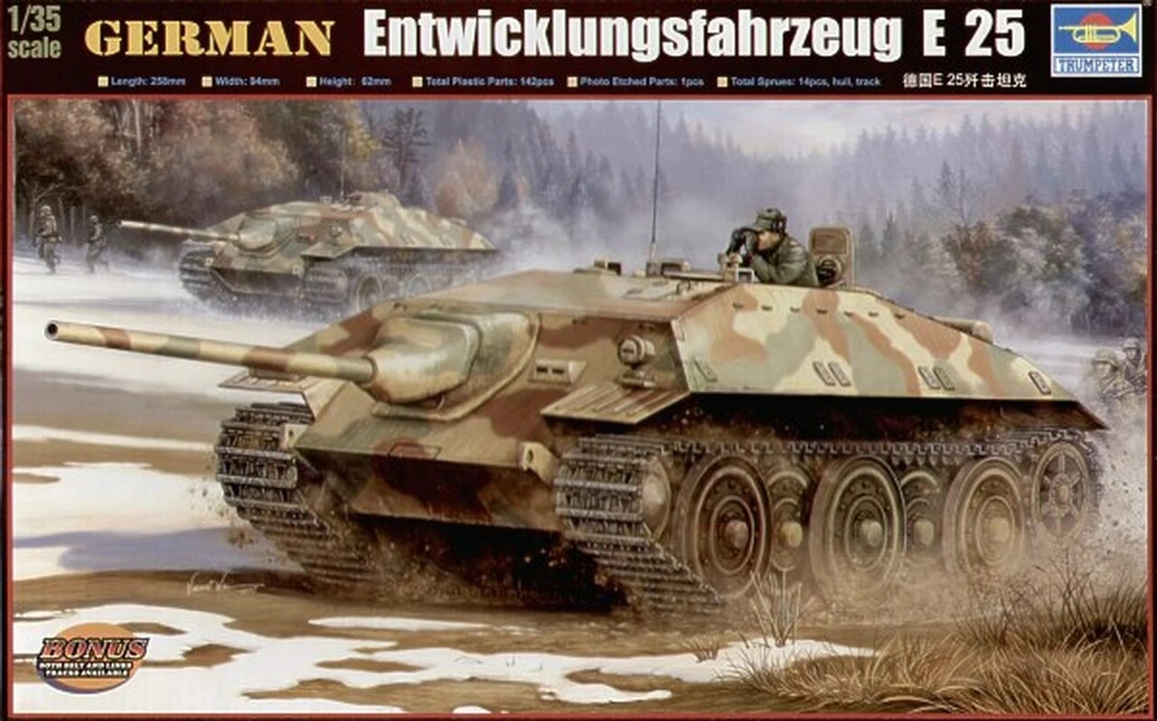 The E 25 was the second largest Panzer in the Entwicklungsfahrzeug series.The detailed design contract was awarded to Argus Werke in Karlsruhe, with the design project directed by Dr. Klaue. The E 25 was to have rear drive and share many parts with the E 10. In January 1945, the Entwicklungskommission decided that this design was still worth pursuing as it again filled a vacancy in the Panzerprogramm for vehicles in the 25-ton class. A drawing shows the E 25 outfitted with a 7.5cm Pak L/70 gun mounted on the glacis plate. Selection of a weapon for series production hadnβt been determined in January 1945. Only a few Versuchsfahrgestell were ordered. The design had not proceeded far enough to consider mass production. According to Oberbaurat Kniepkamp in postwar interrogations, three E 25 hulls were reported to be at Alkett in Berlin-Spandau, but they were no longer there when Western Allies went to investigate.Β