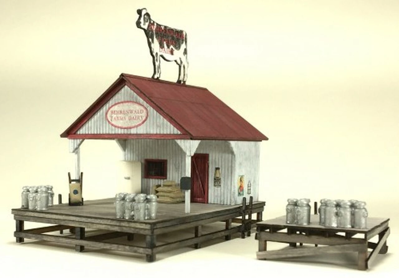 Precision cut from quality milled basswoods and 3-ply aircraft grade birch plywood, the Dairy Transfer Kit incorporates all the attributes customers are used to enjoying in an American Model Builders LASERkit: tab and slotted wall and roof assembly; peel and stick windows, doors, and trim; simulated metal roofing; both ΒcrackedΒ and solid office window glazing; platform ladders; full color signage with large cow-shaped rooftop billboard; and an assortment of resin cast parts depicting milk cans, salt sacks, a hand truck, an other details for accessorizing the larger platform/office structure. The finish structures measure 1.375 inch square x 0.5 inch tall and 2.625 inch long x 3.5 inch deep x 2.75 inch high to peek of roof respectively.