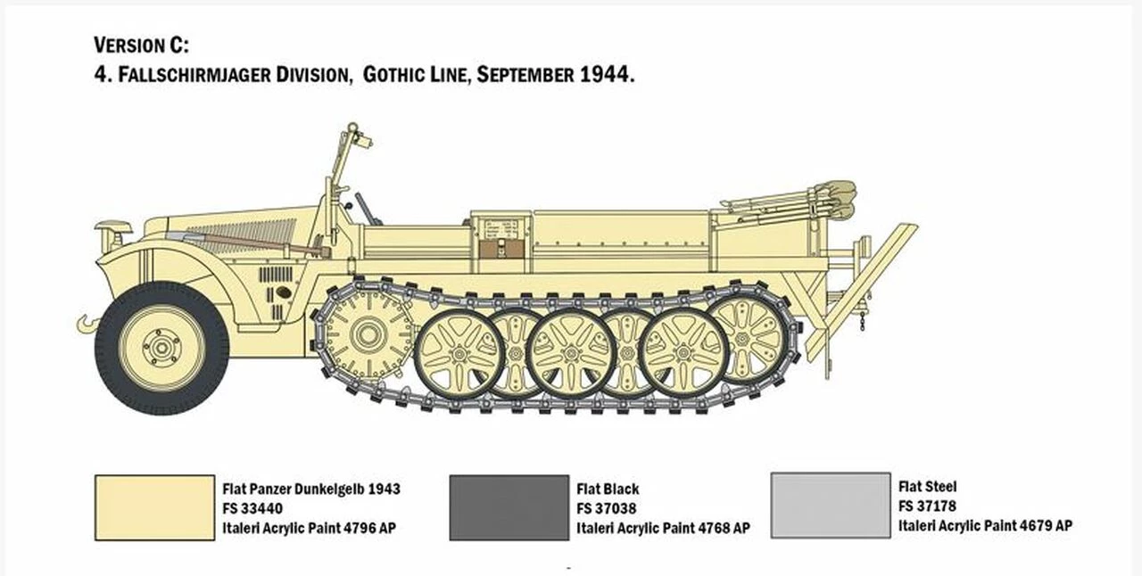 The Sd.Kfz 10 Demag D7 half-track was used by the German troops in large numbers during the Second World War on all the main fronts from the invasion of Poland, to North Africa, to Russia. It was design and developed to be an effective prime mover for small towed artillery as anti-aircraft and anti-tank guns. The Demag D7Β could carry eight fully equipped soldiers in addition to towing a gun or a trailer. The 4.2-liter Maybach 6-cylinder engine , positioned in the front of the vehicle, could delivered 99 hp. Thanks to its engine the half-track was able to reach a max speed of 65 km/h and to have a good on road and off road performance. The vehicle was reliable and flexible and it was produced in an important number of units and in several versions. Its frame was also the base to implement modifications and improvements directly from the field workshops in order to have vehicles fully in line with the specifics of the operating theaters.