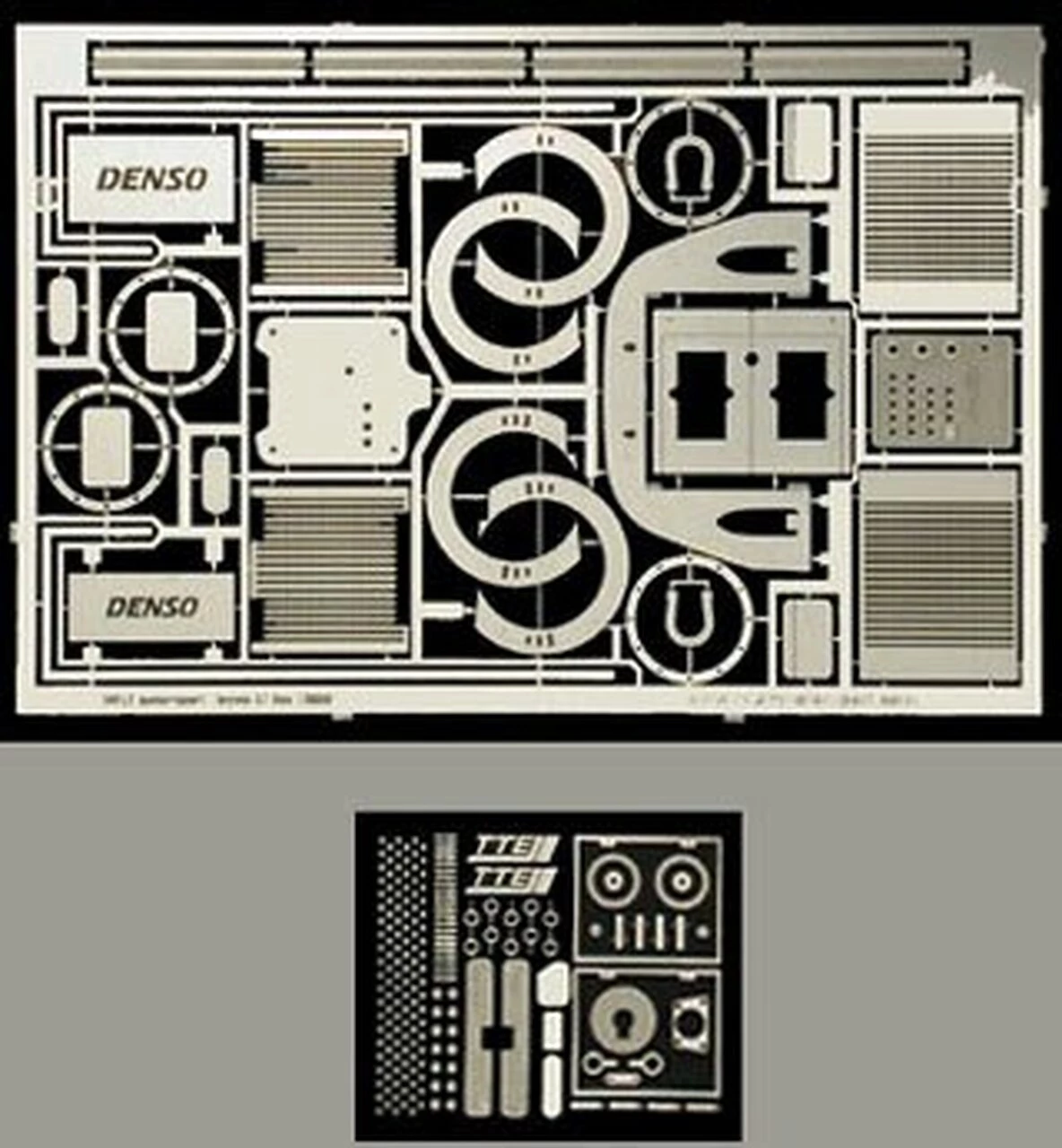 Designed for Tamiya Toyota GT-One kit #24222. Nickel Steel Photoetch Fret: Hose Clamps, Heat Shield Frames, Monocoque Radiators, Mirrors, Hub Details, Heat Shields, Radiator Grill, Monocoque Nose Plate, Front Brake Discs, Rear Brake Discs, Front and Rear Tow Hooks, Heat Shields, Rear Bulkhead, Dashboard. Rubber Back Photoetch Sheet: Body Work Rivets, Toggle Switches for Dashboard, Window Clips, Badges, Body Work Clips, Engine Badges, Pedals, Car Number Frames, Fuel Fillers, Door hinges, Steering Wheel Base Plate, Kill Switch Pull, Suspension Bracket