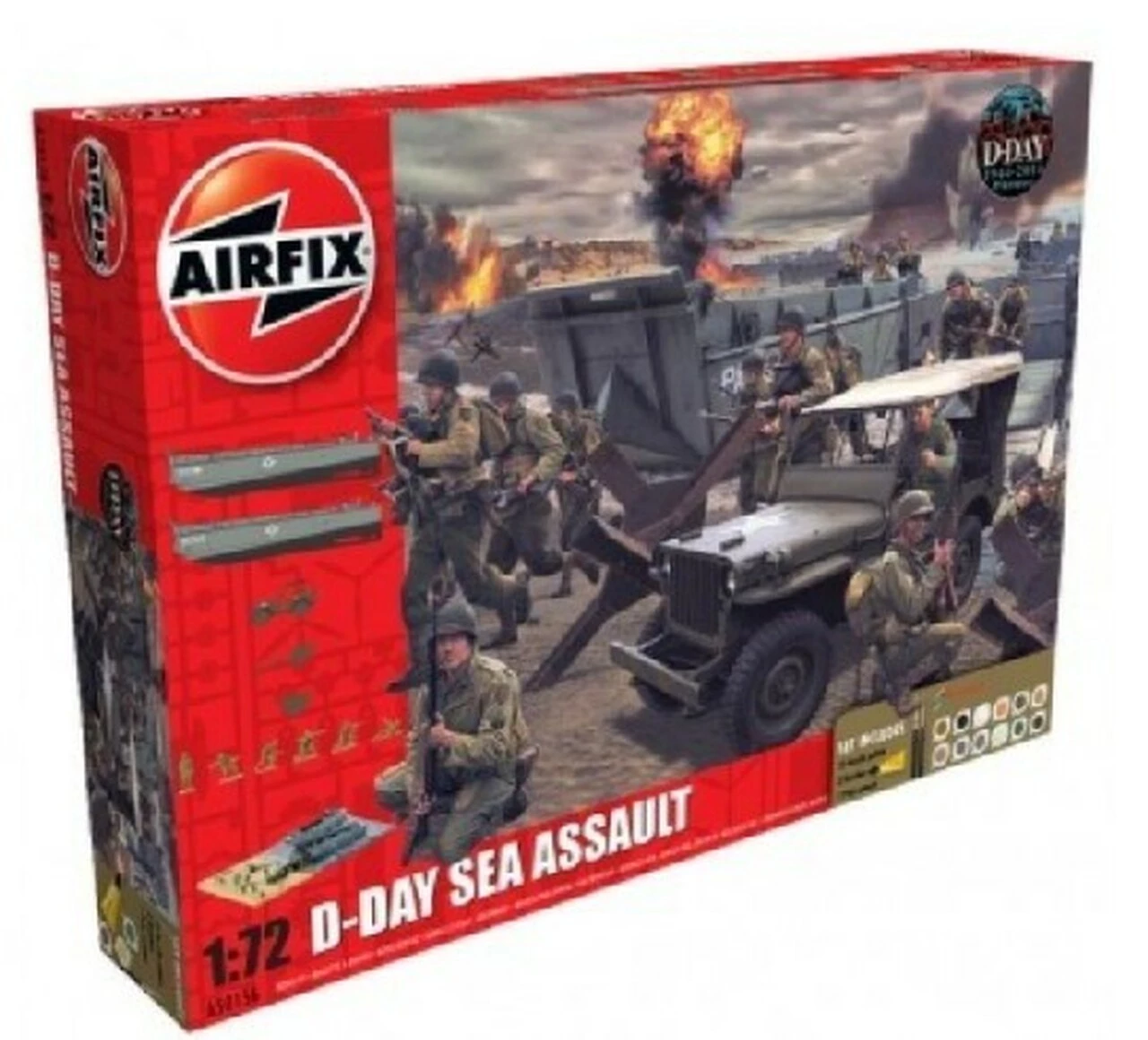 Β Includes beach diorama base,Β 2 LCVP Higgins boats, Willys MB Jeep, trailer,Β Howitzer and 45 US Infantry figures.Β