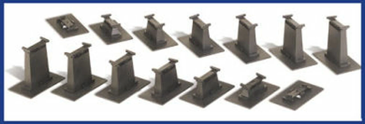 HO Scale. Fast and easy assembly and trouble-free set up. This pier set is compatible with most other popular track with roadbed systems. With this pier set, you can create an over/under figure 8 track. Pivoting track bracket for best support of track incline. Removable design for floor or carpet set up. These black plastic piers may be nailed to your railroad layout for permanent installation. Assembly instructions are included.