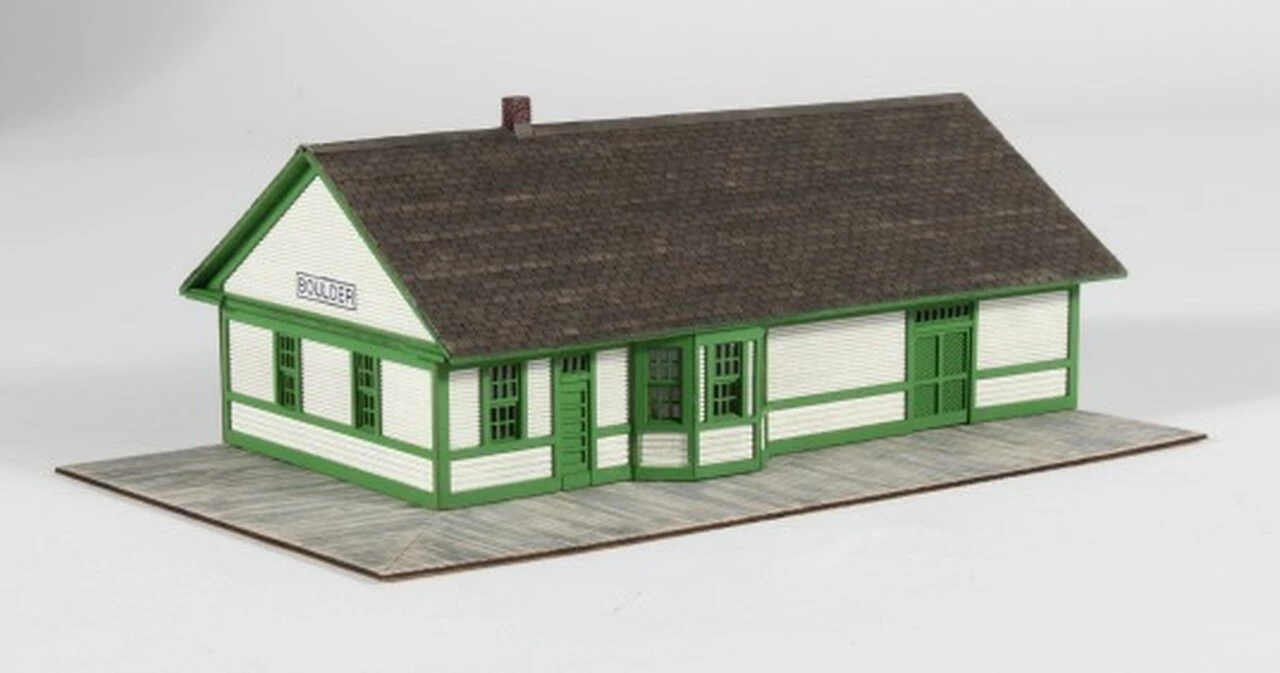 Kit features: walls, soffit, roof, and platform that are 100 percent laser-cut from quality aircraft grade 3-ply birch plywood with custom laser-scribed siding, wainscoting, and platform deck; individual peel & stick 3-tabbed style shingle strips; the 1909 depot designΒs hallmark angled bay window; characteristic roof access ladder hanging on the freight side end wall; laser-cut peel & stick doors, windows with glazing, and trim Β all that assemble with ease; resin cast chimney; and clear concise illustrated instructions. Assembled structure measures 4.625Β Wide x 2.875Β Deep x 1.75Β High, including roof overhang, and, when mounted on trackside platform, measures 5.5Β Wide x 3.625Β Deep.
