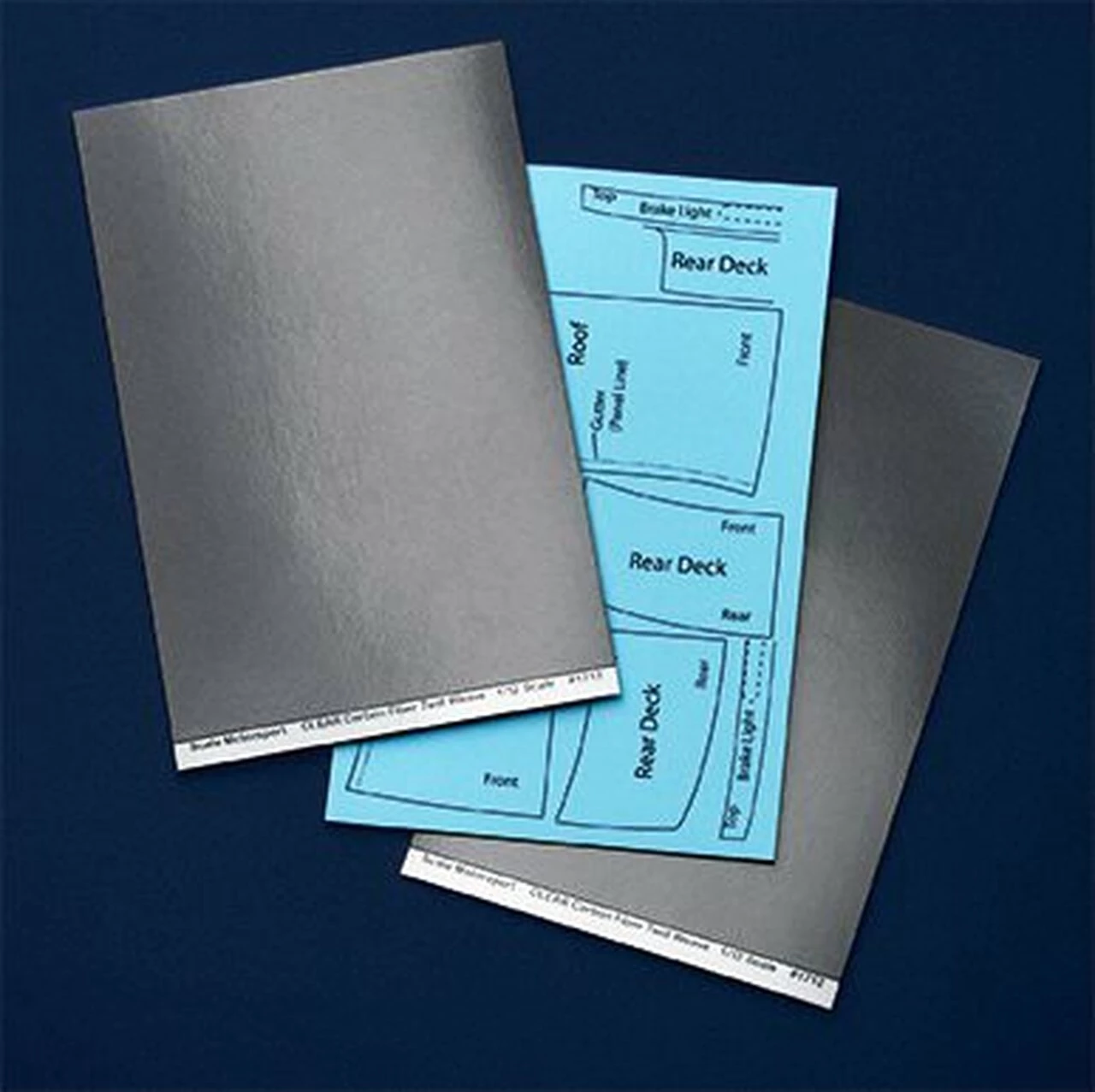 1/12 scale. This exterior carbon fiber package consists of four sheets of twill weave pattern containing template patterns for the hood, roof, rear deck, spoiler and rear light panel. The fourth sheet, not in the photo, is an extra carbon fiber sheet with no templates, used to create your own additional template parts!