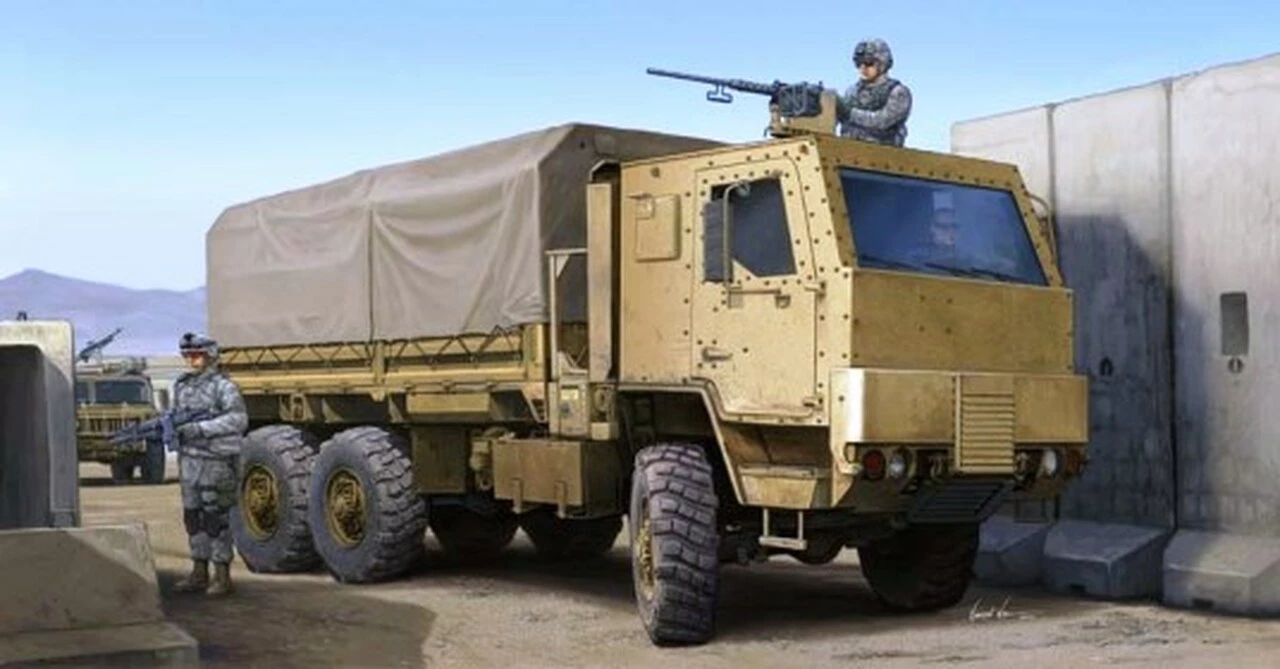 The M1083 Standard Cargo Truck is designed to transport cargo and soldiers. The M1083 has a payload capacity of 10,000 pounds and to facilitate loading/unloading, the bed side rails are mounted on hinges. The cargo bed can be equipped with an optional bench seat kit for transport of soldiers. The bench seats are constructed of a non-wood material and attach to the cargo bed side rails. The seats can be folded down and stowed when not in use. Soldiers are assisted climbing in and out of the cargo bed area with the aid of a ladder stowed on the vehicle when not in use. A canvas and bows kit is provided to keep soldiers and cargo protected from the elements. The M1083 can be equipped with a self-recovery winch capable of fore/aft vehicle recovery operations. The winch has 280 feet of line capacity and 15,500 pounds bare drum line pull at 110% overload.Β