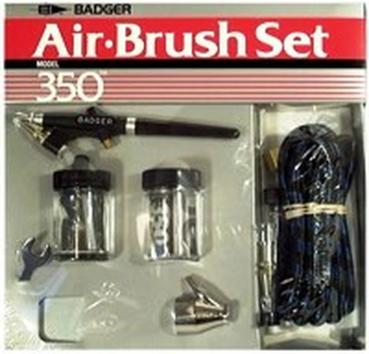 Contains 350 Medium air brush with attachable jar, braided air hose with varying air source fitting, additional jar with cover, oz. color cup, Fine and Heavy nozzles and fluid assemblies, wrench for needle assembly and instruction manual in a corrugated box