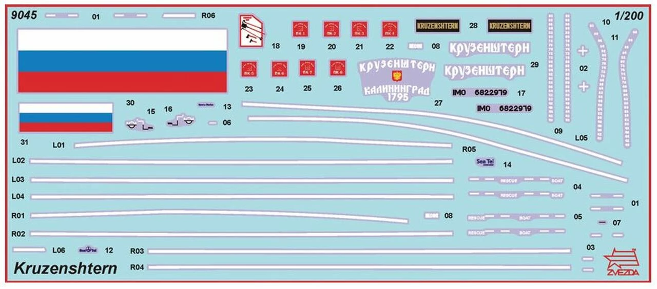 1/200 Scale plastic model kit. Requires paint and cement for assembly (not included). The sail training ship Kruzenshtern is a four-masted barque, named after the famous Russian admiral and explorer Ivan Fyodorovich Krusenstern. Nowadays the barque Kruzenshtern belongs to the ΒBaltic Fishing Fleet State AcademyΒ of Russia and is used for training purposes. However, the history of this vessel goes back to 1926, when, according to the old tradition, the daughter of one of the ship-owners Β Eric F. Laeisz, gave her the name ΒPaduaΒ. No one could assume what a long and nice destiny is intended to a new sailing vessel. It has entered into ten of the largest sailing vessels of the world and made numerous transoceanic and round-the-world expeditions.