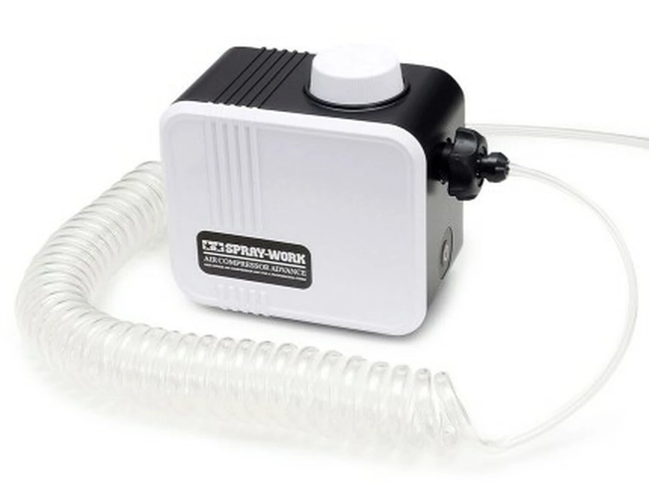 This is a very lightweight and compact air compressor designed to work with Tamiyaβs Spray Work range of airbrushes. It includes an AC adapter with parts to allow use of power in countries across the globe! While compact, this compressorβs 0.08MPa continuous pressure rating ensures plenty of power for great paint jobs on a range of plastic models, from blanket painting of larger areas, to the picking out of more detailed sections like camouflage on military models.