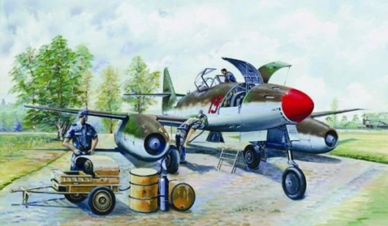 Being the first operational jet fighter of the world, the Messerschmitt Me 262 was one of the most advanced aircraft of its time. Development for this plane began as early as 1938 and the first prototype made its maiden flight (still propulsed by a piston engine) in April 1941. The first jet powered version flew in July 1942. Full scale production started in November 1943 but two major aspects, one political and one technical, stopped its fast introduction to front line fighter units. The political factor was that the plane should be used as a fast bomber instead of a fighter, and it took until late 1944 and early 1945 until it was officially allowed to use this plane as a fighter. The technical problem was the reliability and availability of the jet engines. They had only a lifetime of about 10 flying hours and production never reached the output necessary. The principal operational versions were the Me 262A-1A Schwalbe (Swallow) interceptor and the Me 262A-2A Sturmvogel (Storm Bird). The Schwalbe was built in a number of sub-types with alternative armament installations. Despite all these problems, over 1400 planes were actually built and put into service. Although the plane was not as maneuverable as its piston driven counterparts, its overall performance was superior to many other aircraft of its time. There are several aircraft left in museums around the world.