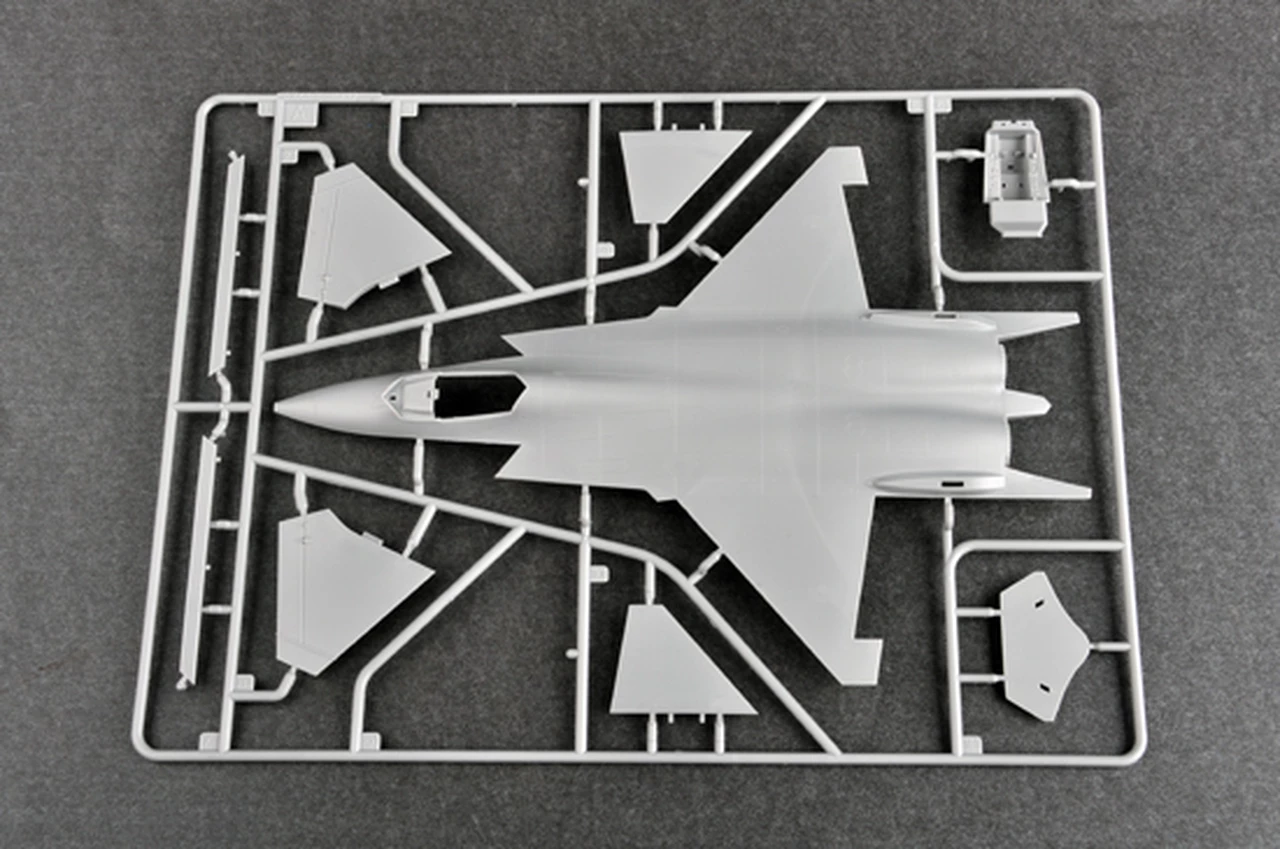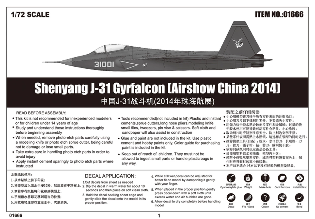 The Chinese J31, known as the Gyrfalcon or Falcon Hawk is a twinengine jet fighter put into service in 2012. Smaller than the Chengdu J20, the J31 more resembles the F35 with its two internal weapon bays. Kit consists of over 110 parts, including clear parts.