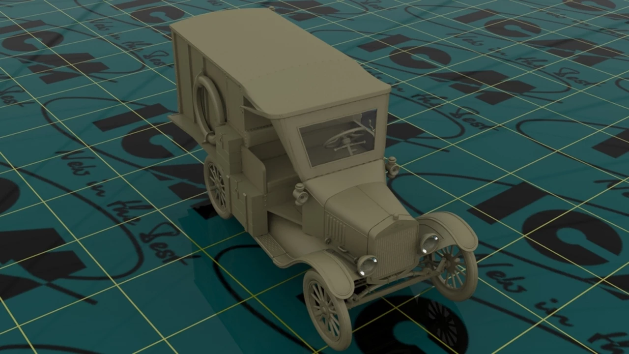 One of the most numerous and famous cars in world history is the Model T, produced by the Ford Motor Company. It was the first mass-production car affordable to the middle class. The first example was built in September 1908. It had a 22.5hp four-cylinder engine. Over 15 million were built between 1908 and 1927. Model Tβs were produced in different types. In 1917 it became a base for an ambulance. Its light weight made it well-suited for use on muddy and shell-torn roads in forward combat areas. By November 1918, 4362 Model T ambulances had been shipped overseas. It was the most common Allied ambulance during the war.