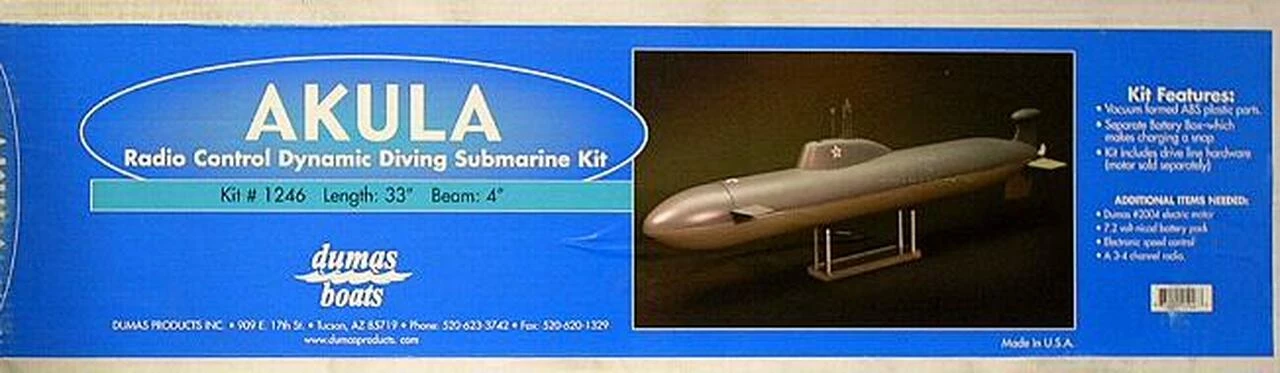 The Akula is a easy to assemble sport scale model of a Russian nuclear attack sub. This kit is made of ABS Plastic. This is a ready to run kit. Skill level 2