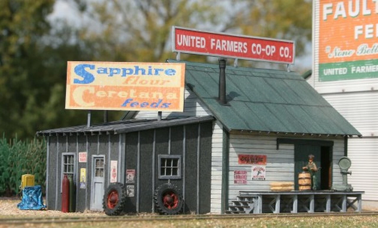 Although not based on any specific prototype, our laser-cut wood kit reflects the spirit of these farmer co-ops, so prevalent in the hundreds of small towns dotting the breadbasket region of the country. A great companion piece to our Kit No. 193 Country Elevator, this structure is right at home trackside providing a warehouse for supplies received by rail as well as offering a truck loading dock, store front, gas pump, and an attached repair shed, where tractor and implement repairs and welding services could be procured. Topped off with colorful billboard signage, the Farmers Co-op features AMBΒs usual tab and slot wall construction; peel and stick windows/doors/trim; rafter tails; dock height floor; laser-cut tarpaper, battens, and roofing materials; and an assortment of custom white metal and cast resin detail parts.Β