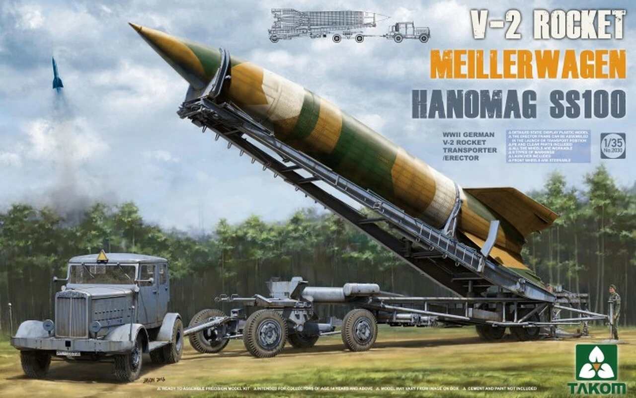 V-2 was the world’s first long-range guided ballistic missile. The Meillerwagen was a German World War II trailer used to transport a V-2 rocket from the ‘transloading point’ of the Technical Troop Area to the ‘launching point’, to erect the missile on the Brennstand firing stand and to act as the service gantry for fueling and launch preparation.Β The Hanomag SS-100 tractor was a civilian vehicle that was pressed into military service.