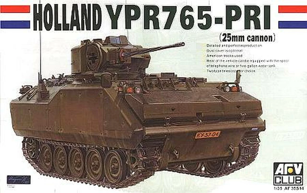 1/35 scale. Dutch Army YPR765-PRI Infantry Fighting Vehicle plastic model kit by AFV Club. This is AFV Club’s new kit on the Dutch Army version of the YPR-765 with the turret mounted 25mm cannon. The kit includes photo-etched detail parts and markings for 2 Dutch vehicles. Skill level 2