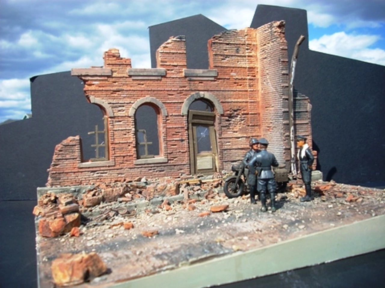 1-35 Scale. This kit features an 8″ x 10 1/2″ base which models an incline, something that is rarely seen in a diorama. Also included are beautifully detailed hydrocal castings, laser cut wood door and windows, laser cut shattered glass, cast rubble & bricks and complete, easy to understand painting and aging instructions. Figures/vehicles not included.