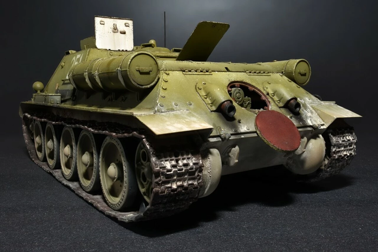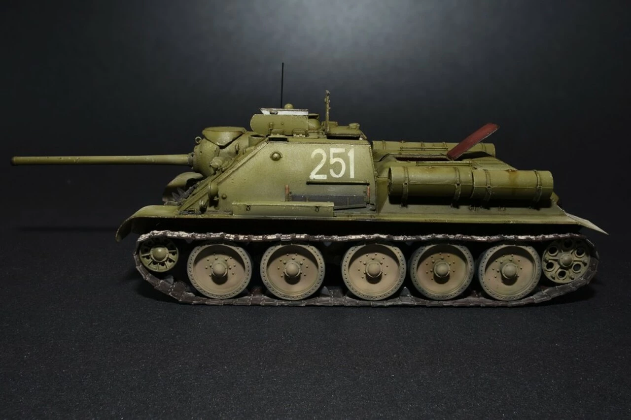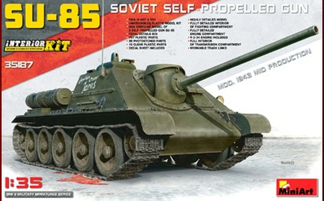 The SU-85 (Samokhodnaya ustanovka 85) was a Soviet self-propelled gun used during World War II, developed on the basis of the T-34 medium tank and the SU-122 assault gun. Produced from August 1943 through July 1944, the 85mm D-5S gun allowed the SU-85 to effectively hit enemy medium tanks at distances of more than 1000 meters and was able to destroy a Tiger tank from 1000 meters out, proving much capable against the newer German tank designs.