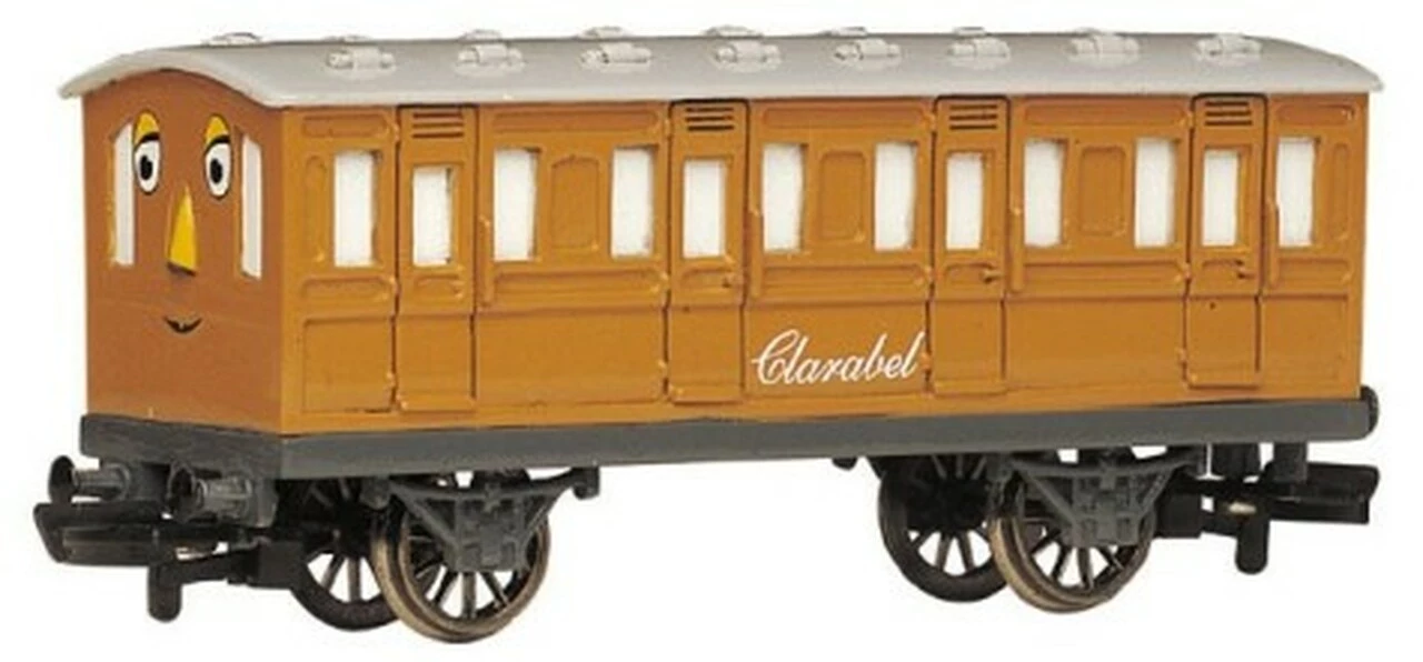 HO Scale. Clarabel, one of Thomas’s favorite coaches! International style hook and loop couplers on each end. Four metal wheels. Detailed passenger car body design. For use on HO/OO scale track (compatible with Bachmann’s E-Z Track).