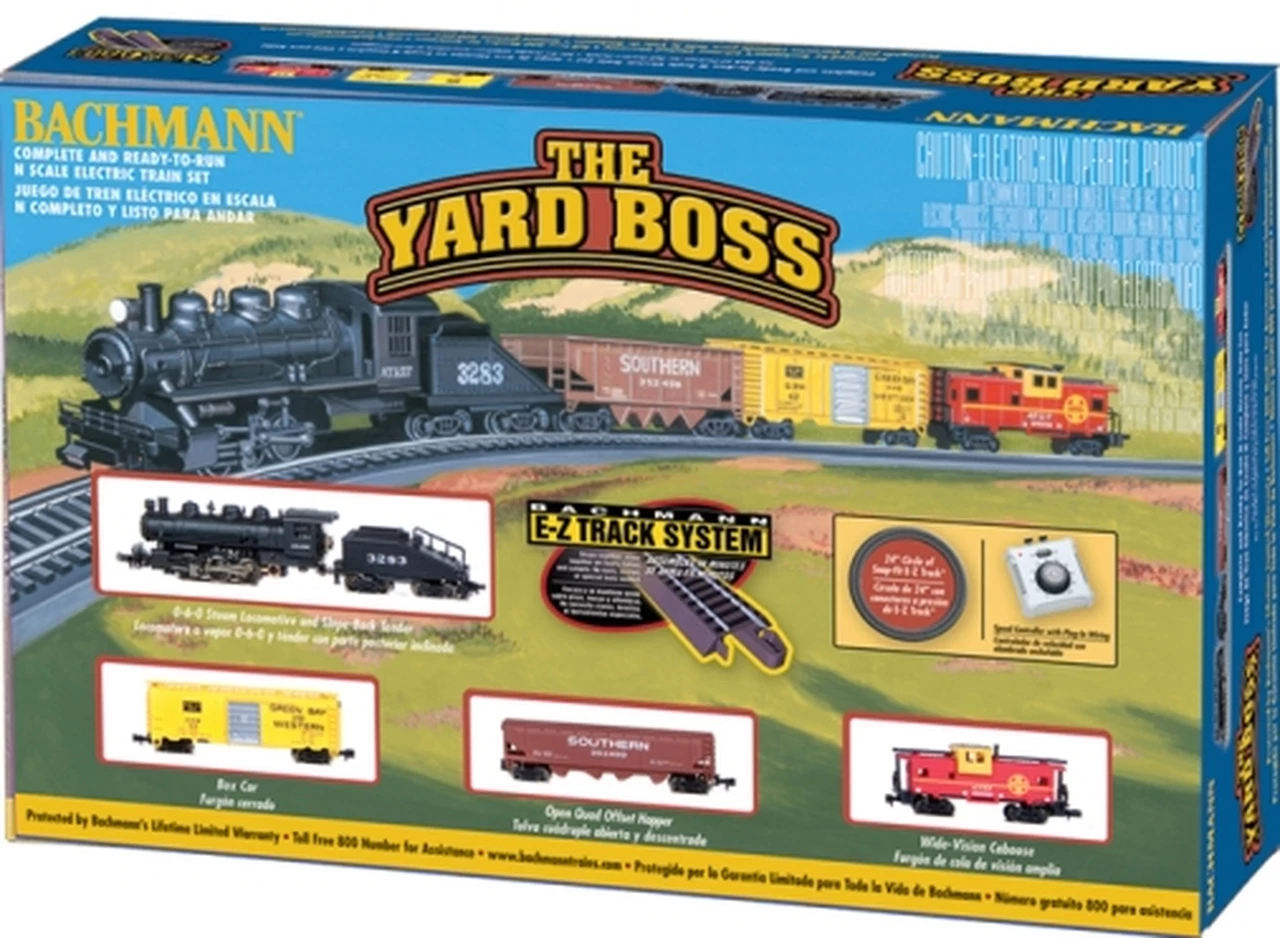 When theres freight to be moved, theres nothing like the raw power of a steam locomotive to get the job done. Our Yard Boss train set comes complete with Bachmanns exclusive E-Z Track snap-fit track and roadbed system, plus: An 0-6-0 steam locomotive and tender, box car, quad hopper, wide-vision caboose, 24 circle of nickel silver E-Z Track including 11 pieces curved track and 1 curved plug-in terminal rerailer, power pack and speed controller, illustrated instruction manual.