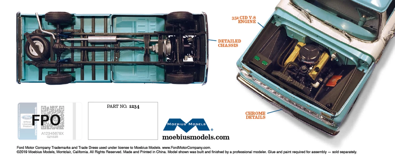 Part of the fourth generation of the popular FordΒ F-Series, the 1965 Custom Cab Styleside PickupΒ touted a 129-inch wheelbase, an 8-foot bed, andΒ Fordβs revolutionary Twin I-Beam suspension.Β This new feature, which provided an independentΒ axle for each front wheel, was designed toΒ allow greater control and smoother driving overΒ rough roads.Β Moebius Modelsβ precision-tooled styrene modelΒ kit of the 1965 Custom Cab Styleside PickupΒ features a full interior, detailed chassis and 352Β CID V-8 engine. The completed model measuresΒ over 7 inches long, and includes clear andΒ chrome-plated parts, PVC tires, decal sheetΒ and detailed instructions. Paint and cement areΒ required for assembly β sold separately.