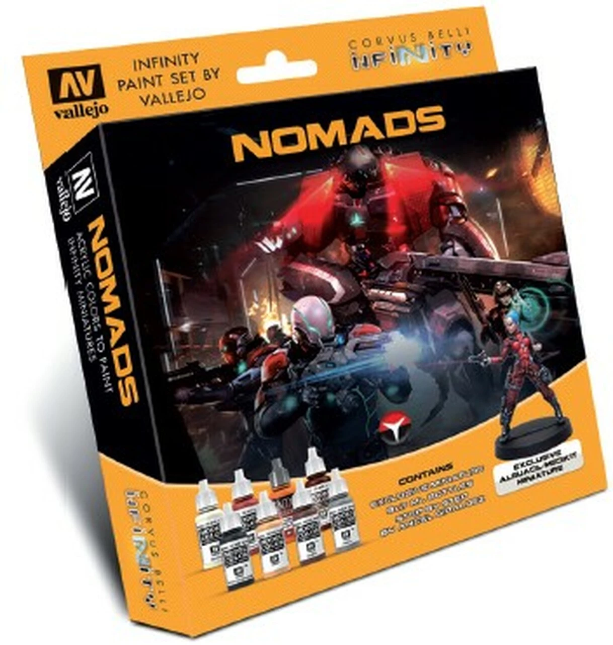 The Infinity painting sets are the result of the collaboration between Corvus Belli and Vallejo Hobby Colors. A set designed for beginners in the hobby, amateur painters looking to expand their skills, or experts who want to have all the colors needed to paint their favorite miniatures in a single pack. You will also find the colors needed to paint your Nomads Faction.