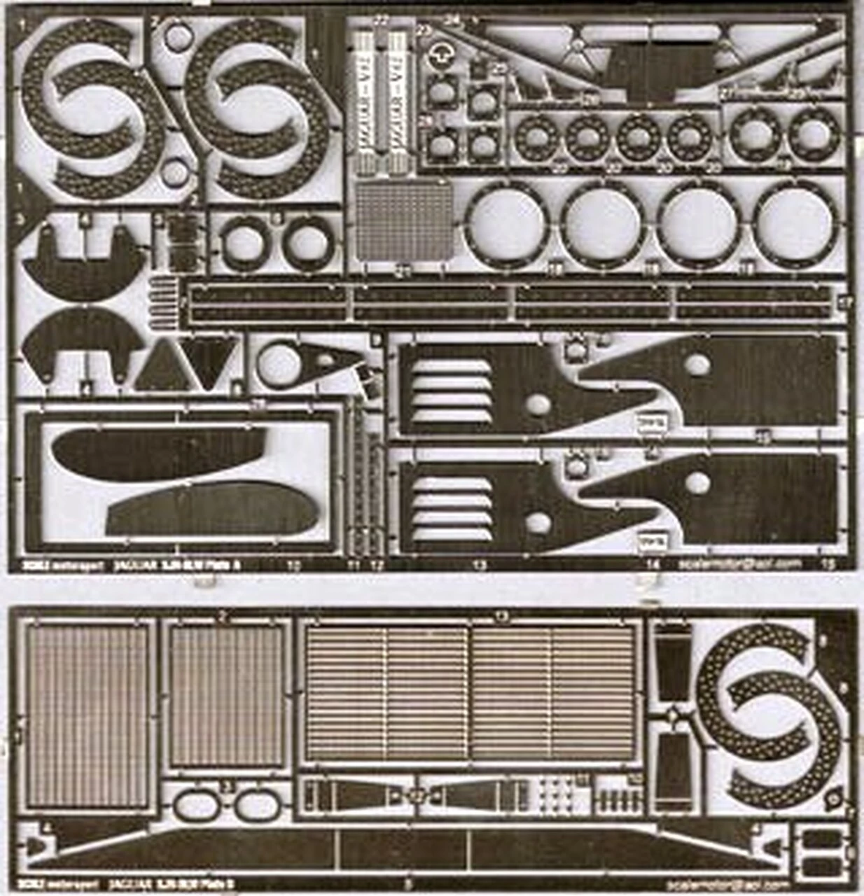 Designed for Tamiya Jaguar XJR-9LM kit sku#: 24084 Nickel Steel. Photoetch Frets Contain: Fret A: Brake Rotors, Fuel Filler, Rear Brake Disc Shields, Fuel Filler Supports, Fuel Filler Brackets, Wheel Locks, Engine Mounts, Front Tow Hook, Wing End Plates, Oil Tank Bracket, Oil Tank Bracket, Engine Badges, Rear Body Clips, Hub Detail, Fuel Fillers, Hub Detail, Engine Badges, Oil Tank Cap, Rear Crossmember, Flow Adjuster, Rear Shock Mounts, Kill Switch, Air Box Top. Fret B: Radiator Grill, Radiator Grill, Wing Support Details, Oil Tank Brackets, Air Box, Mirrors, Reservoir Cap, Inside Rear Brake Disc, Fuel Filler Mounts, Side Bodywork Clips, Side Marker Lights, Rear Bodywork Clips
