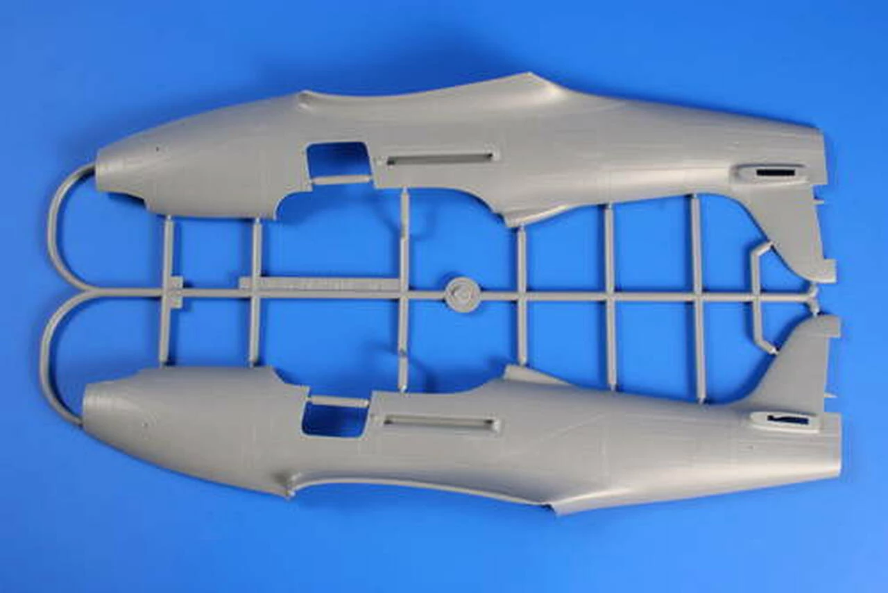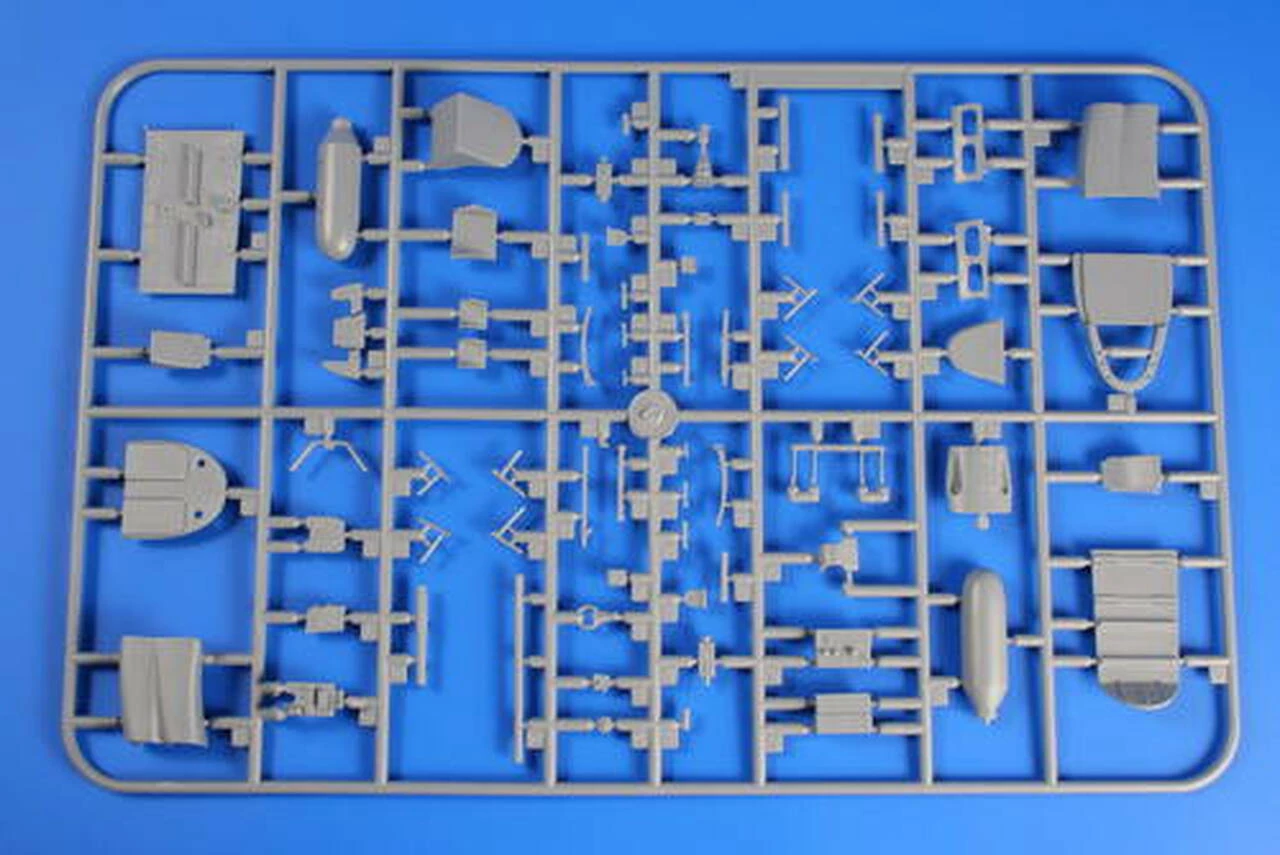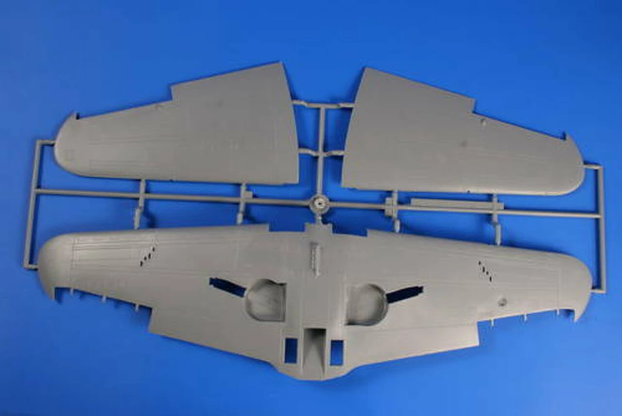 Kit features crisp engraved panel lines, fully equipped cockpit, separately molded control surfaces, well rendered wheel wells and landing gear, choice of drop tank or bomb, propeller with individual blades, optional position cockpit ‘car doors’, injection-molded canopy and door windows, resin parts (exhaust stacks, gunsight), photo-etch parts (bomb fins, nose door hinges, exhaust port panels, inner door details, color cockpit accents and seatbelts).