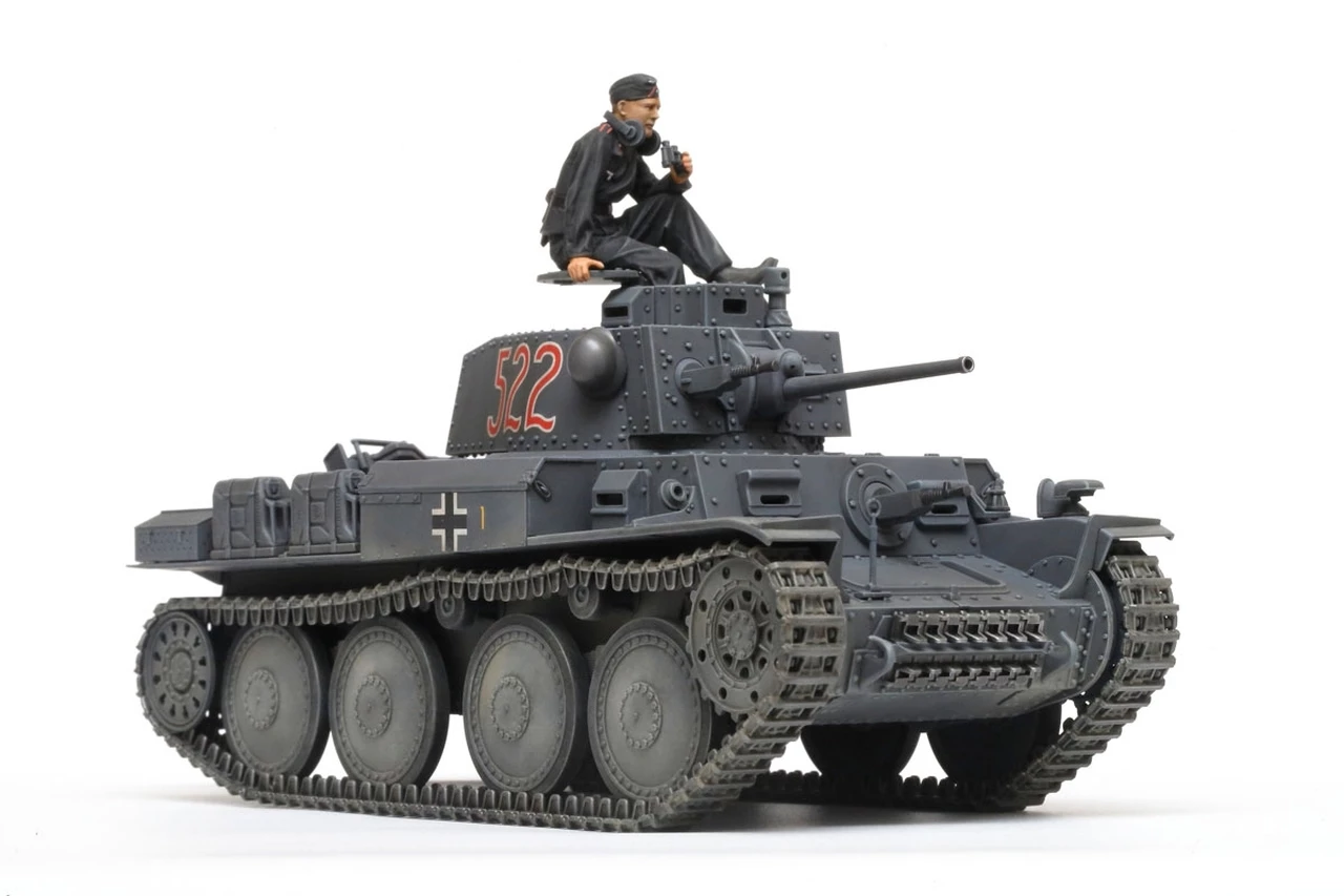 This Tamiya 1/35 scale military miniature recreates one of Germanyβs formidable lightweight tanks. This subject in fact started life as a light tank developed for Czechoslovakia, but was adopted and renamed 38(t) by German forces after their occupation of the country in 1939. It was equipped with a 3.7cm main gun and could reach speeds of up to 42km/h powered by the 125hp engine. A number of variants were produced, of which the Ausf. E/F 38(t)s were manufactured over a one-year period from November 1940; they featured improved armor and were thrown into the conflict with Soviet forces after the start of Operation Barbarossa.