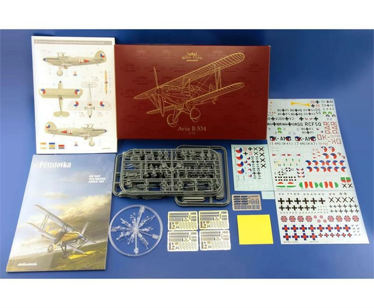 Royal Class edition of Avia B.534 in 1/72 scale. This kit is the first release of the new 2015 tool. Kit contains sprues, photo-etched details and painting masks for 4 complete scale kits in different variants. Includes 28 decal options. with color PE parts and die-cut painting masks.