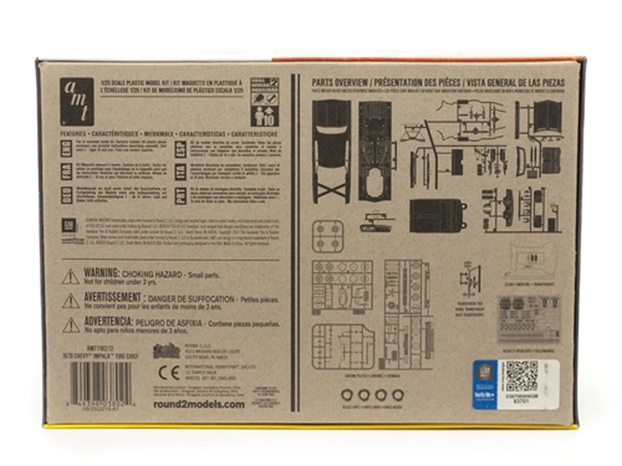 Thereβs a four alarm blaze and AMTβs Fire Chief is at the scene. This long-lost version of AMTβs 1970 Impala is back, complete with all the exciting accessories included once again! Itβs even better than the original release, with newly tooled, accurate stock Chevy wheels and hubcaps. Build an authentic Fire Chief car outfitted with a flasher bar and siren, CB radio, spotlight, fire department graphics and more!