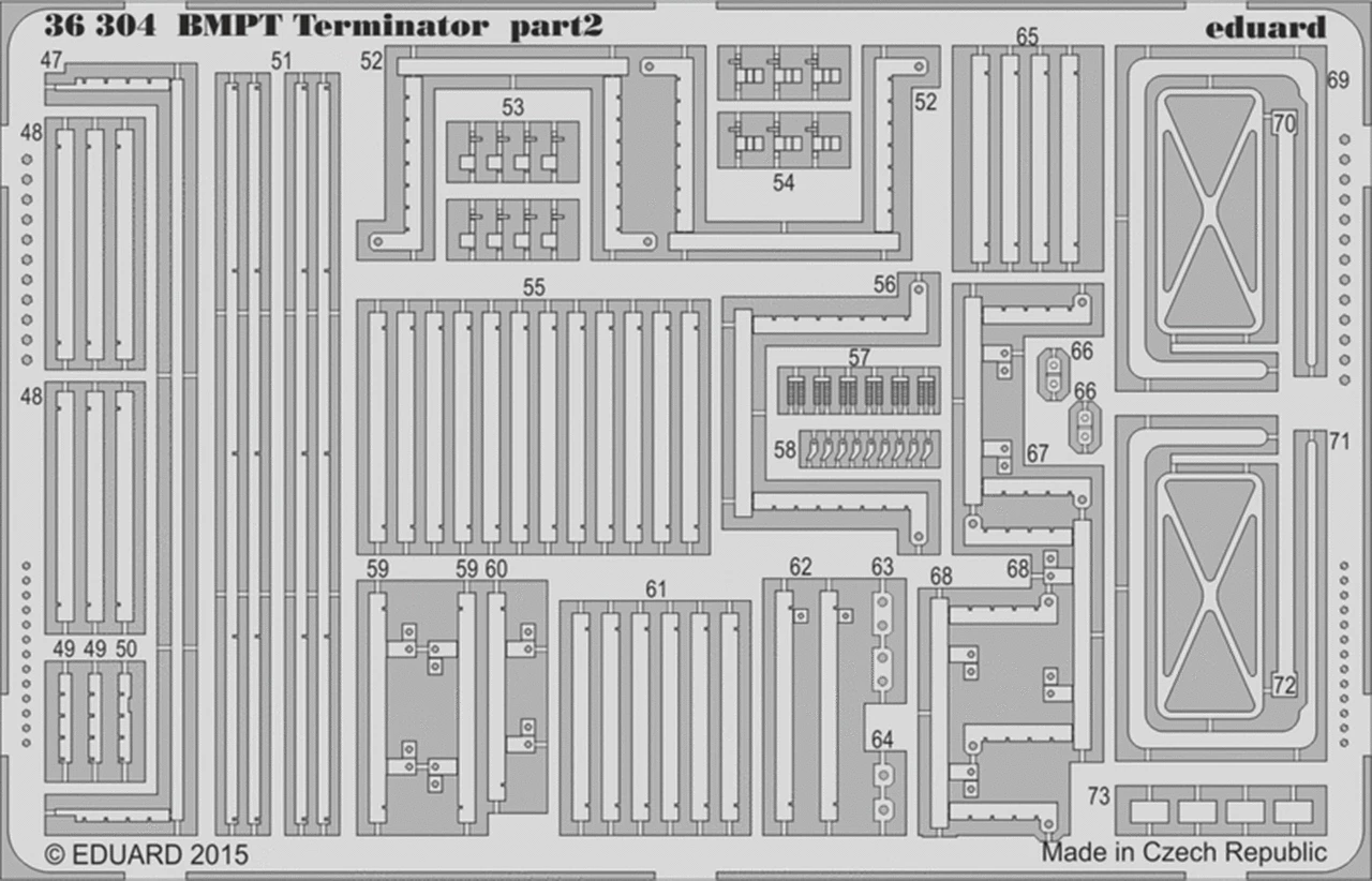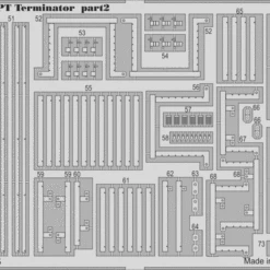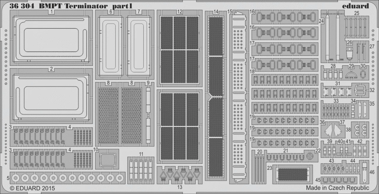 Two sheets of photoetched detail parts for Meng’s 1/35th scale BMPT Terminato