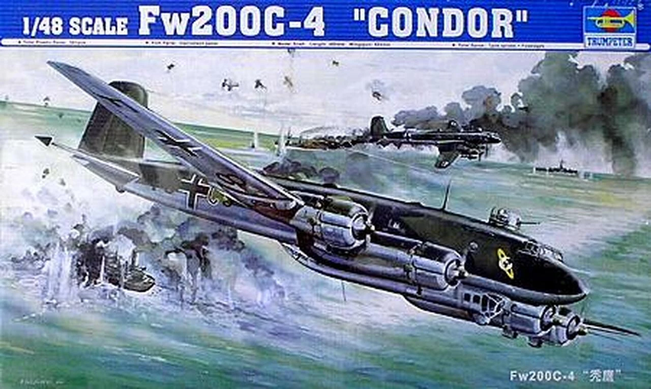 The Fw200 was designed in 1936 as an airliner for the Lufthansa. It was low-winged and featured mainly all-metal construction. Its first flight was in July 1937. Although originally a commercial aircraft converted to military use, it was as a maritime patrol bomber that the Fw200C-3/4 Condor made its mark during the Second World War. In this capacity, acting in cooperation with U-boat packs, it formed one of the most effective Luftwaffe combinations of the war, and many a convoy was to rue the moment it first spied a Condor above the horizon. Meantime, the airline Fw200Bs and the few pre-production C-0s were pressed into service as transports. Production continued until early 1944 through sub types C-1, -2, -3, -4 and -6, with a total of 263 Condors of all versions being built. Towards the end of the war, when the Fw200 marauding tactics had been largely mitigated, several Condors were diverted to transport duties for the use of Hitler and his staff. A projected development, the Fw300, with enlarged wing span and inline engines of greater power, did not progress beyond the design stage.