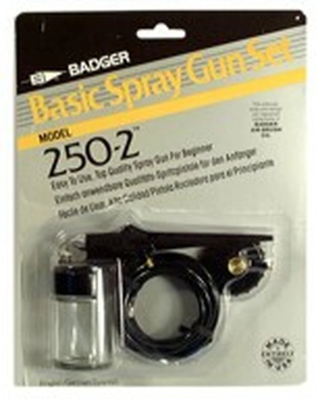 Contains 250 spray gun with attached jar, Propel regulator, vinyl air hose, on a blister card.