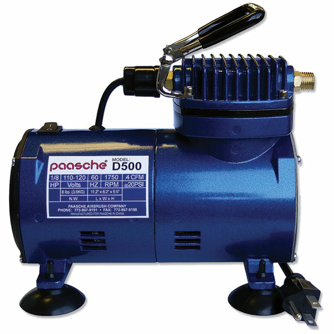 The D500 is a 1/8 HP piston compressor. The compressor is equipped with an auto shutoff switch which turns the compressor off when the airbrush is not being used. Will deliver up to 20-30 PSI depending on airbrush being used. Noise level is 47 dbs