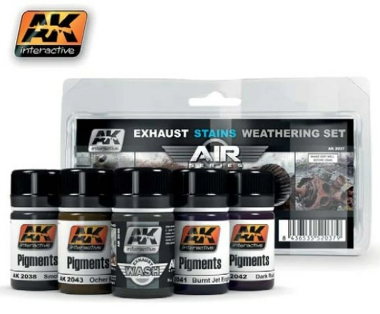This set of weathering products from our new line called Air Series. This particular set focuses on aircraft exhaust stains. In this set there are 4 pigments and one wash: AK2038 Smoke, AK2040 Exhaust Wash, AK2041 Burnt Jet Engine, AK2042 Dark Rust, and AK2043 Ocher Rust.