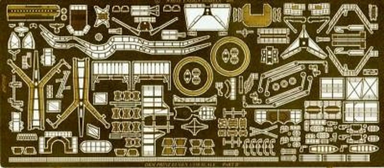 WEM 1/350 Prinz Eugen (PE 35124) For the Trumpeter kit. Fret 1 Contains: Stock 3-Bar Railing, Handrails for Superstructure, Handrails for Bulwark Tops, Railings (Aft Conning Tower Deck), Railings (Landing C18), Railings (Lower Superstructure Aft), Railings (Lower Superstructure Fwd), Railings (Shaped for Focsle), Railings (Bow), Railings (Lower Superstructure Mid Aft), Railings (Lower Superstructure Mid Fwd), Railings (Superstructure Aft 105 Deck), Railings (Superstructure Fwd 105 Deck), Railings (Aft Superstructure Deck A1), Railings (Mainmast Platform B2 Fwd), Railings (Hangar Well Edges), Railings (Fwd Superstructure Deck A14), Railings (Bruckenhaus Deck A12), Railings (Mainmast Platforms), Railings (Turret Top AA Platforms), Railings (Foretop Director), Ship’s Boats Wheels, Railings (Bridge Deck Aft A2), Short Step Ladders, Railings (Admiral’s Bridge Roof), Railings (Mainmast Searchlight Platform Fwd), As 26 above with Canvas Dodgers, Railings (Mainmast Searchlight Platform), As 28 above with Canvas Dodgers, Railings (Aft Auxiliary Conning Position), Railings (Admiral’s Bridge Rear), Funnel Stack Handrails (Curved), Funnel Stack Handrails (Straight), Funnel Cap Handrails (Curved), Funnel Cap Handrails (Straight), Searchlight Lens Grilles, Upper Bridge Lookout Platforms, Marx Float Bases, Aft Director Mast Yardarm, Crane Jib Ladders, FuMo 22 Radar Antenna, FuMb 4 Radar Detection Antennas, FuMb 7 Radar Detection Antenna, Bow Anchor Man’s Platforms, FuMo 25 Radar Antenna, FuMo 26 Radar Antenna (Late), FuMo 26 Radar Antenna (Early), FuMo 27 Radar Antennas, Paravane Detail Parts, Foremast Top Yardarm, Mainmast Top Yardarm, Inclined Ladder Replacements F11, Inclined Ladder Replacement B24, Inclined Ladder Replacement B23, Inclined Ladder Replacements F6, Inclined Ladders Fore & Aft Superstructure, Vertical Ladder Stock, Cable Reel Replacements G36, Cable Reel Replacements G19, Watertight Doors, Watertight Hatches; Fret 2 Contains: Aircraft Catapult, Catapult Pulley Wheels, Catapult Servicing Platform, Aircraft Launch Cradle, Sea Boat Boarding Platforms, Turmmast Rear Yardarm Footbars, Mainmast Upper Platform Yardarms, Funnel Vent Boat Cradles Port (Early Fit), Funnel Vent Deck (D8 Replacement Early Fit), Funnel Vent Boat Cradles Starboard (Early Fit), Retractable Bridge Wing Railings, Retractable Bridge Wing Decks, Accommodation Ladder Handrails, Accommodation Ladder Rigging, Inclined Ladder Replacement B23, Arado Ar-196 Seaplane Parts, Stern Eagle Crest, Lower Superstructure Rails, Mainmast Range Clock, Wire Antenna Spreaders (Forward PlatformA11), Turmmast Rear Platform & Yardarms C10), Turmmast Forward Yardarms, Mainmast Upper Platform Supports, Forward Conning Tower Director Antenna, Torpedo Stowage Catwalks, Mainmast Lower Platform & Yardarms, Admiral’s Bridge Wire Antenna Spreaders, Accommodation Ladder Steps, Bridge Rear Platform on Deck A12, Paravane Rack (Starboard), Sea Boat Launching Gantry Parts, A and D Turret Deck Rings, Hawser Reel Replacements F10, Mainmast Radar Antenna Platform, Main Boat Crane Rigging, Large Crane Hooks, Admiral’s Bridge Fore & Aft Supports, Main Boat Crane Jib, Funnel Side Platform Braces, Funnel Forward House Starboard Supports, Crane Jib Rest (Starboard Side), Crane Jib Rest (Port Side), Funnel Forward House Port Support, Small Loading Booms, Paravane Rack (Port), Main Director Top Greenhouse Frame D10, Marx Float Racks (Superstructure Front & Rear), Anchor Chain Stock, Funnel Lower Catwalk, Funnel Cap Grille, Prop Guards, Forward Boat Cradles (Port Outer), Port Forward Boat Cradle Centre Beams, Port Forward Boat Cradle Support Frame, Forward Boat Cradles (Port Inner), Forward Boat Cradles (Stbd Inner), Starboard Forward Boat Cradle Centre Beams, Forward Boat Cradles (Stbd Outer), Starboard Forward Boat Cradle Support Frame, Turmmast Searchlight Platform Railing, Turmmast Searchlight Platform (Early Fit), Admiral’s Bridge Supports (Lateral), Marx Float Racks (Funnel Sides), Funnel Aft Siren Platform, Funnel Forward Siren Platform, Aft Boat Cradle Frame (Port), Aft Boat Cradles (Port), Aft Boat Cradles (Stbd), Aft Boat Cradle Frame (Stbd), Anchor Chain Stoppers, Inclined Ladder Replacement B25, Capstan Handwheels, Replacement Side Director Platforms C16 & C17, Ensign Staff Support Frame, Loading Davits, Aft Gun Platform Supports, Mainmast Tripod Braces, 10.5cm Gun Deck Extensions, Forward Gun Deck Supports, 7mtr Motor Boat Fittings, 11-meter Admiral’s Gig Fittings, 9-meter Captain’s Gig Fittings, 8-meter Cutter Thwarts & Rudder, Open Boat Oars