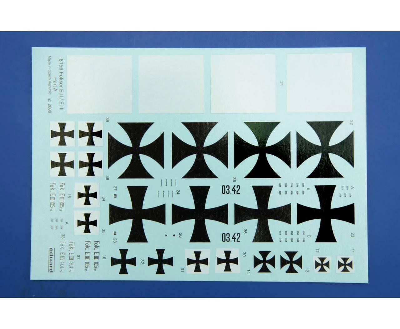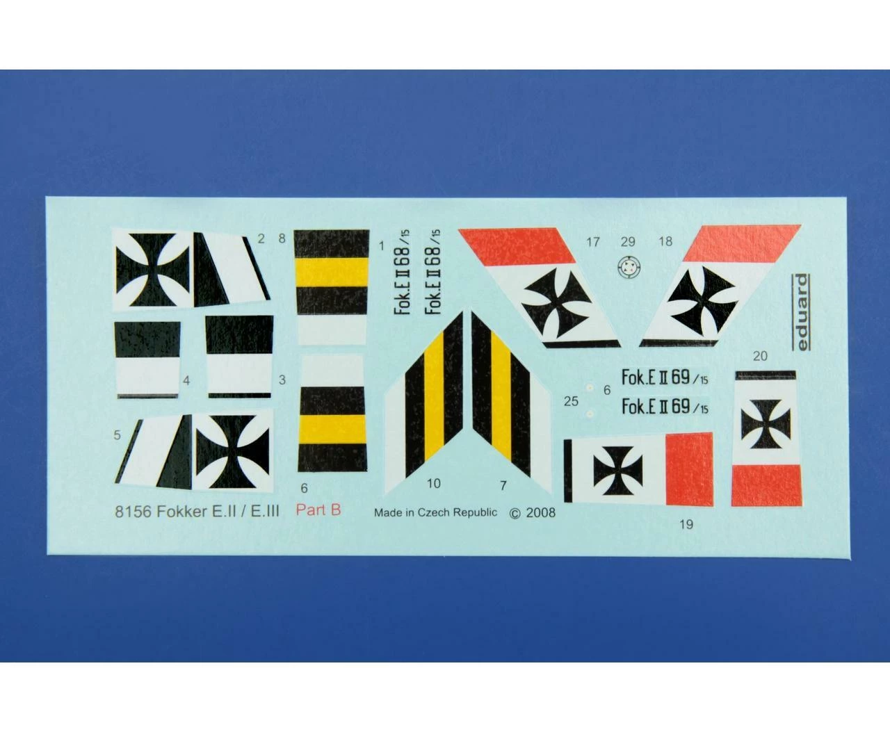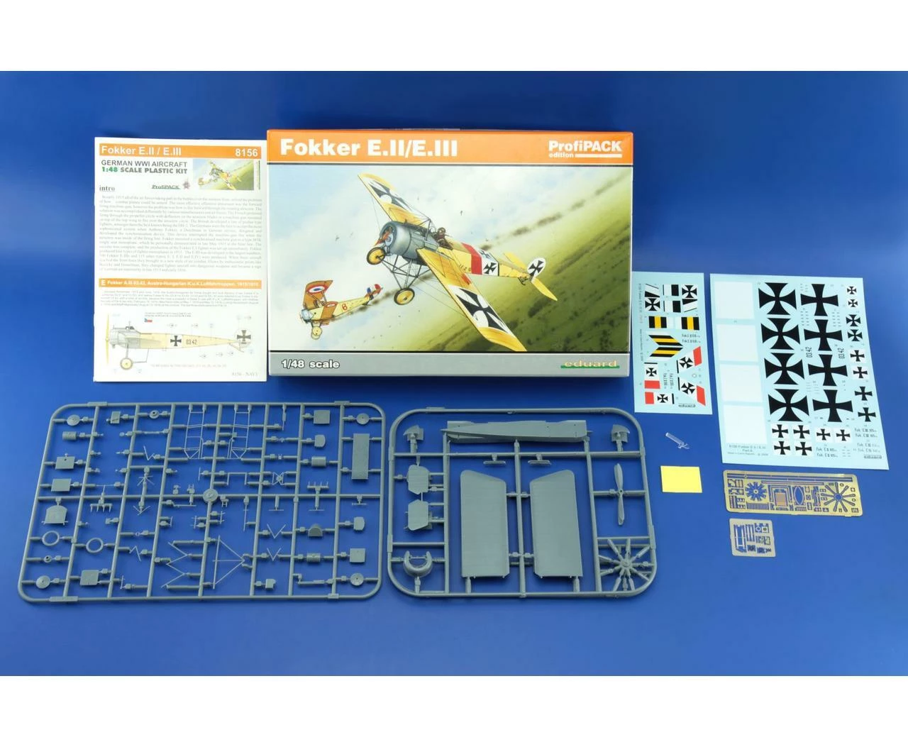 Reissue of Fokker E.III in 48th scale in ProfiPACK edition. Includes Color PE parts, pre-cut painting masks, and decals for 4 aircraft.