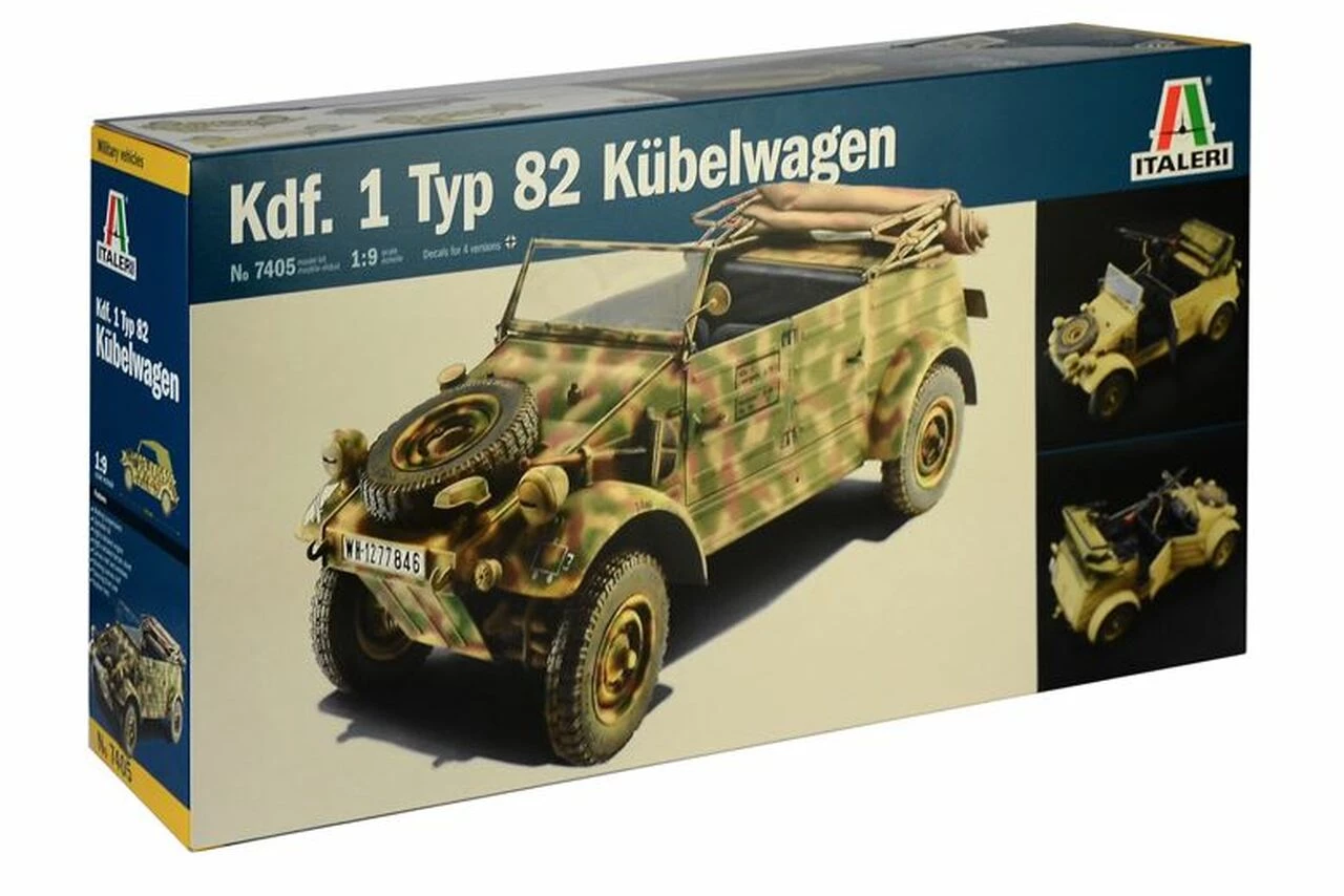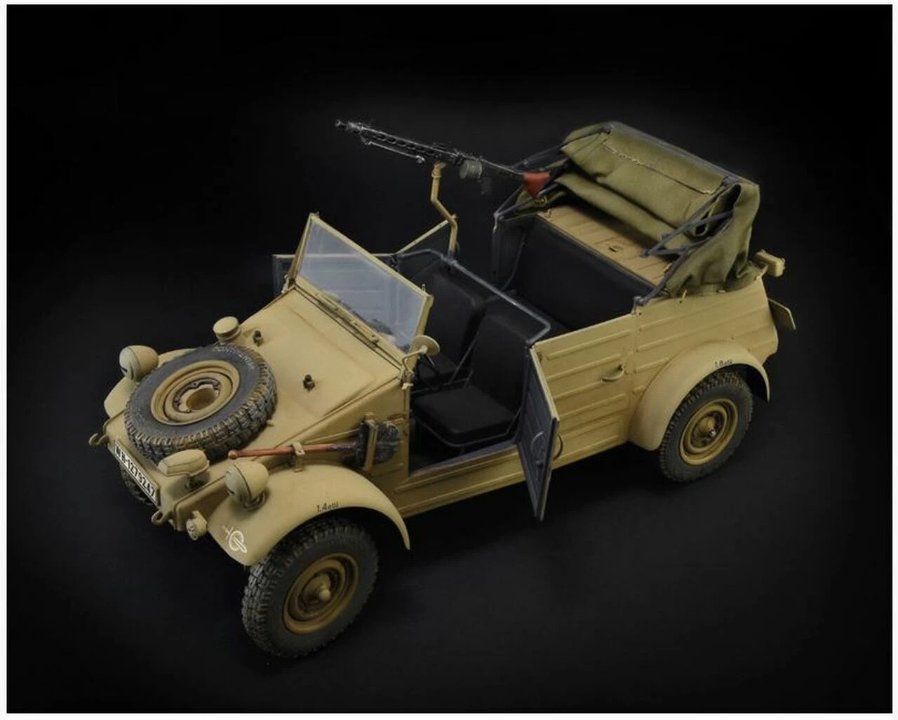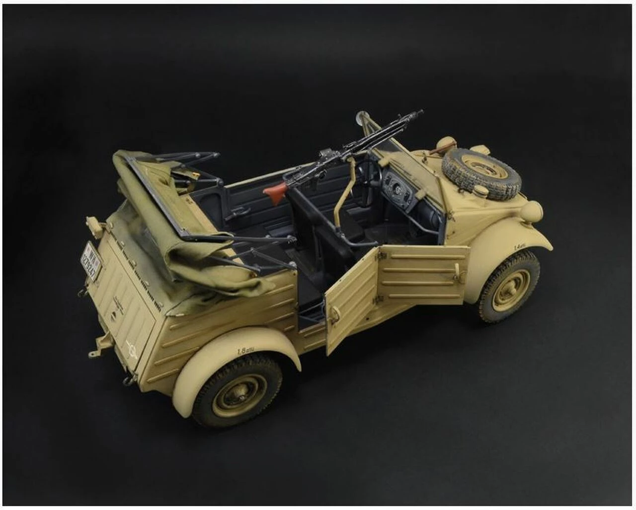 Typ 82 Kubelwagen is one of the most famous military cars of the Second World War. It was designed by the engineer Ferdinand Porsche and produced by the German manufacturer Volkswagen. The project was born to have a simple vehicle, easy to build and easy to maintain and repair. The overall vehicle design is without bends and the bodywork plates are flat. Great simplicity even in the layout of the frame : just a central tube and the back support for the engine and the gearbox. The Kubelwagen, thanks to its petrol engine with a displacement of 998 cm3, was able to reach the max speed of 80 Km/h. The vehicle did not have 4×4 traction but it was extremely reliable on all types of terrain and it was present on all fronts, often in very tough environmental conditions, where the German Army fought during the entire World War II. The Kubelwagen could be armed with a support for a MG34 or MG42 machine gun.