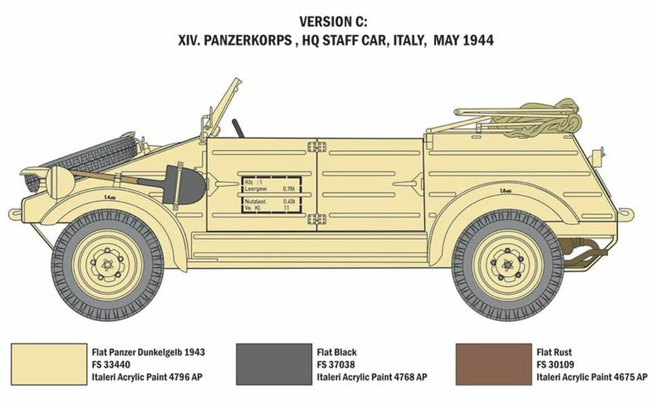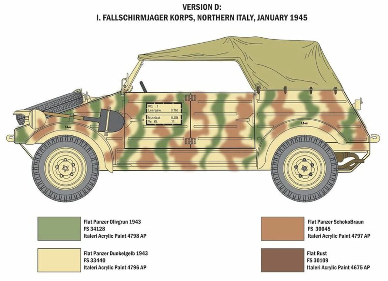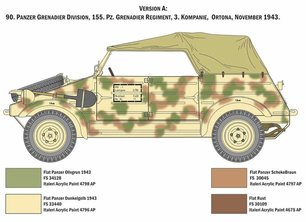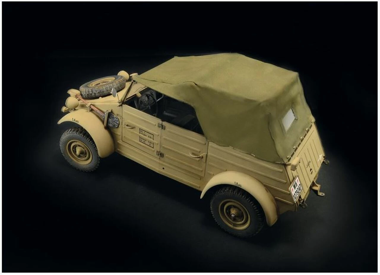 Typ 82 Kubelwagen is one of the most famous military cars of the Second World War. It was designed by the engineer Ferdinand Porsche and produced by the German manufacturer Volkswagen. The project was born to have a simple vehicle, easy to build and easy to maintain and repair. The overall vehicle design is without bends and the bodywork plates are flat. Great simplicity even in the layout of the frame : just a central tube and the back support for the engine and the gearbox. The Kubelwagen, thanks to its petrol engine with a displacement of 998 cm3, was able to reach the max speed of 80 Km/h. The vehicle did not have 4×4 traction but it was extremely reliable on all types of terrain and it was present on all fronts, often in very tough environmental conditions, where the German Army fought during the entire World War II. The Kubelwagen could be armed with a support for a MG34 or MG42 machine gun.