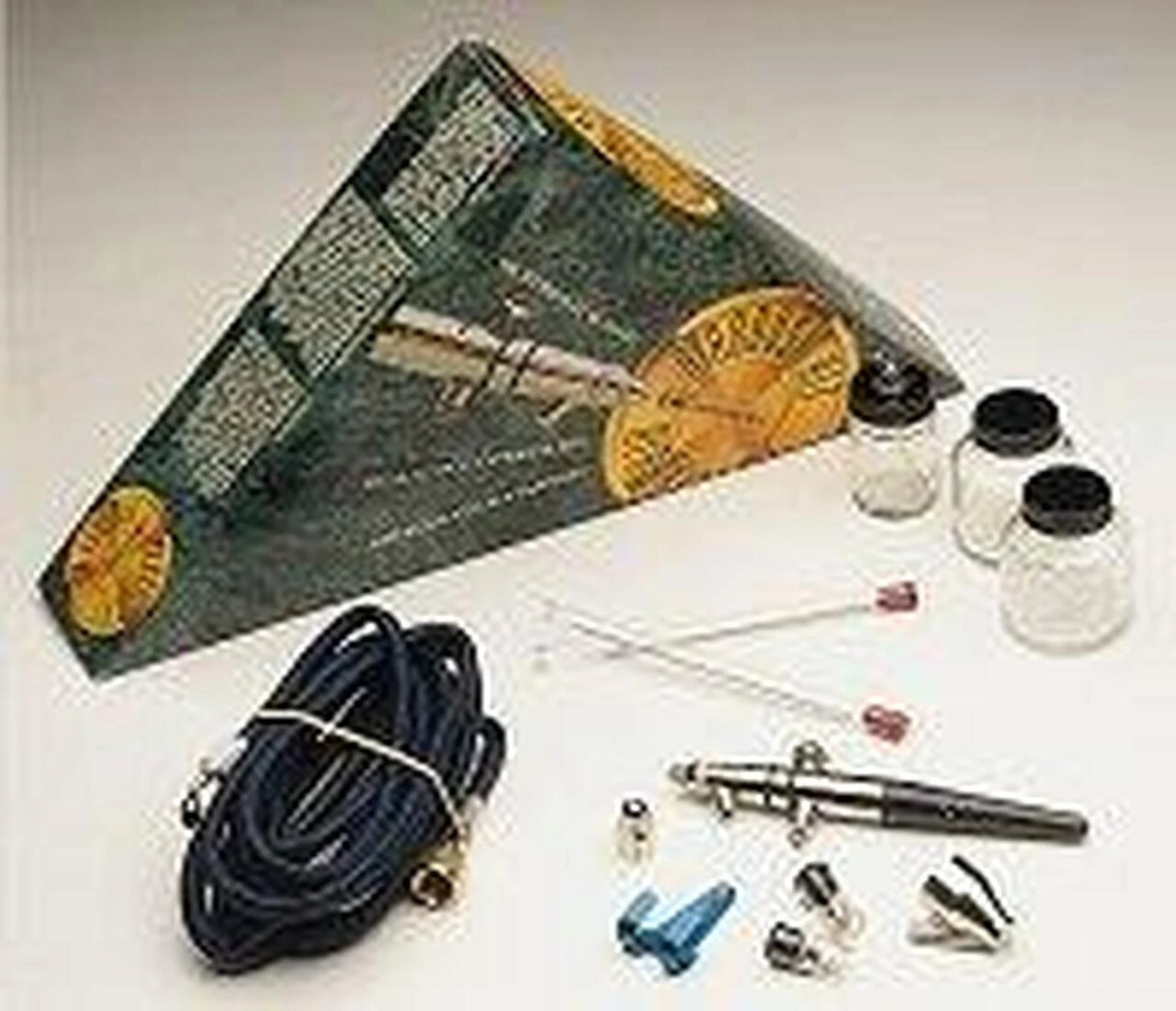 (Complete Air Brush Kit) Set contains 175 Crescendo air brush with all three nozzles / needles (Fine, Medium and Heavy), jar with jar adaptor, two additional jars with covers, braided air hose with varying air source fitting, one 1/4 oz. color cup, trigger pad, protective cap, and instruction manual in an attractive triangular display box.