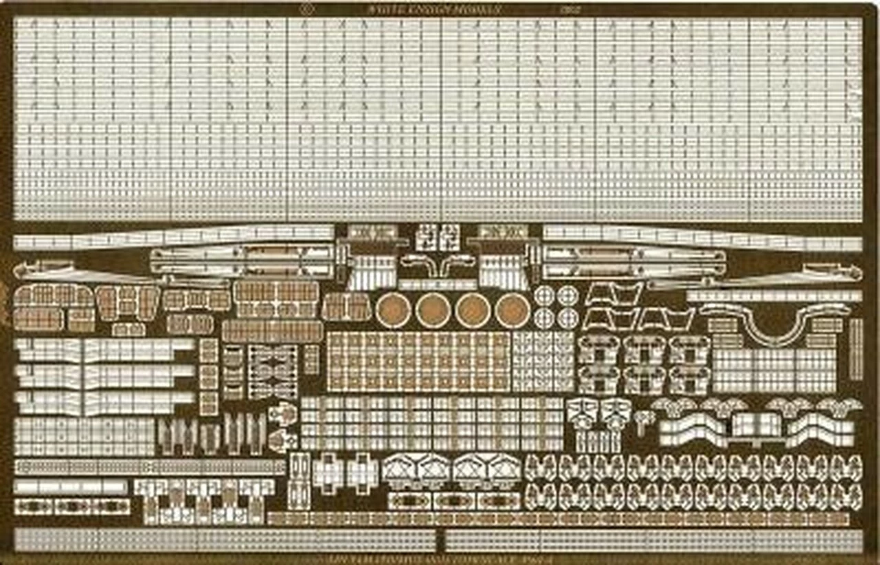 For the Tamiya kits. Contains two sheets of relief etched brass, in different thicknesses for extra realism. Contains aircraft catapult assembly and turntable, aircraft handling trolleys and trolley dolley, ‘Jake’ and ‘Pete’ catapult launch cradles, 25mm triple gun tub footplates, funnel searchlight platform walkway, funnel cap Grills, ‘Ten Ichigo’ funnel emblems, main 46cm gun turret doors, 15.5cm gun barbette riveted seams, turret, sliding door and heat protection strips; main crane hook and kingpost assembly, spar antenna light deck track turntables, main crane jib assembly, flight deck sponson grills, spar antenna tripods, flight deck track sections, small and large flight deck overhang supports, hawse pipe covers, small and medium watertight deck hatches, standard watertight doors, skylight hatches, six types of cable reels, foretop director arm strengthening bars, yardarm antennas, sounding platforms, ammunition box covers, small and large deck access hatches, open and closed watertight doors with escape hatches, 2 bar chain link and 2 bar solid safety rails, single bar walkway and low handrails, 2 bar chain rails for deck undulation, left and right main crane rigging, vent grills for aft 15.5cm barbette and 12.7cm forward and aft barbettes, for aft director tower and aft funnel trunking, foc’s’le vent box grills and flaps, vent cowl grills for forward superstructure, superstructure side small and large vent grills, main 46cm turret top handrails and platform rails, funnel searchlight platform walkway railing, vertical ladders, bridge windows, 7mm, 8mm and 9mm inclined ladders with handrails, main 46cm turret sight lens, main 46cm turret rear door step and canopy, 46cm gun barrel lattices, aircraft catapult mechanism, Type 21 Go Dentan Kai radar antennas and supports, Type 13 Go radar antennas, forward superstructure vent grills, single 25mm AA gun base plates, aft deck vent grills, life rings and stowage racks, triple 25mm AA enclosed turret door and rails, leadsmans’ platforms and rails, open and closed large deck access hatches, ‘Jake’ and ‘Pete’ aircraft parts, searchlight platform footplates, aft director walkways and rails, twin 13mm machine gun mountings, searchlight lens crosses, single 25mm AA gun sights and brace, 46cm outer gun barrel footplates, fittings for open mounted 12.7cm triple, anemometers and open mounted triple 25mm; forward director tower DF antenna, 15.5cm turret top handrails and blast bag testrainer rails, 12.7cm triple enclosed turret railings and barrel shutters and foretop director walkway and handrail.