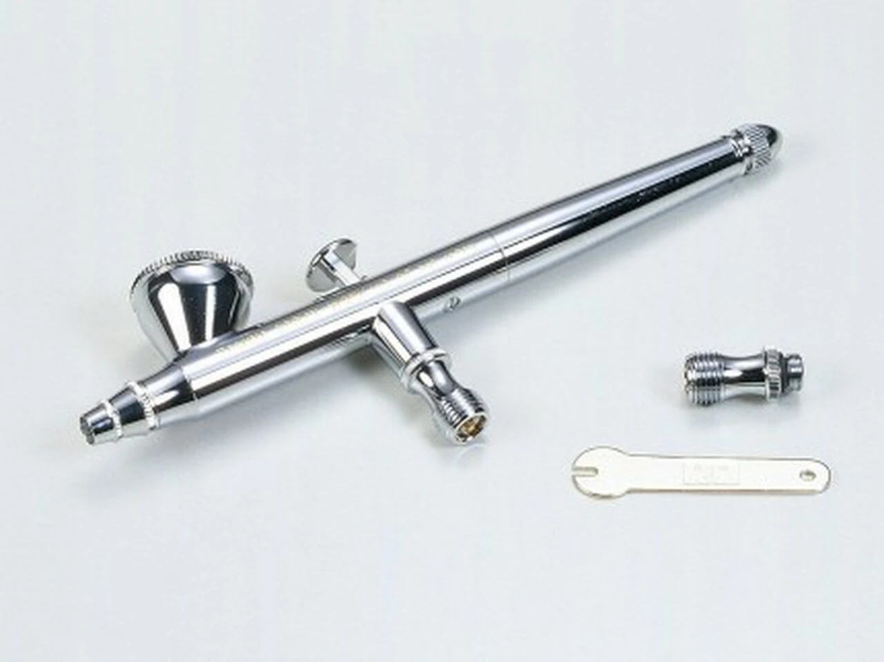 With the HG Super Fine airbrush you can spray with the utmost precision. Able to spray lines under 0.5mm in width, this airbrush is ideal for painting the camouflage on models of the smaller 1/72 scale War Bird collection. 3ml paint cup is molded to main part of the airbrush and the head of the brush has been made light-weight for easy and stable spraying. HG Super Fine Airbrush is also easy to clean after use. This chrome-plated airbrush is both precise and reliable. Removal of air valve joint enables use with Basic Airbrush Compressor Set. Nozzle diameter- 0.2mm