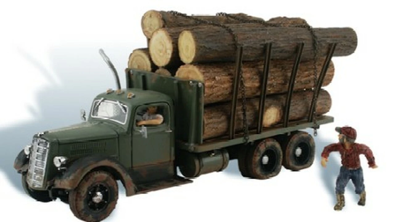 Capture the classic designs and simple lifestyles of the 1940s and ’50s. Each finely crafted, hand-painted automobile, figure and accessory adds color, interest and authenticity to any layout, diorama or project. True 1:87 HO scale models. Tim shouts last-minute instructions to his driver, who takes the lumbering load of logs to the sawmill.